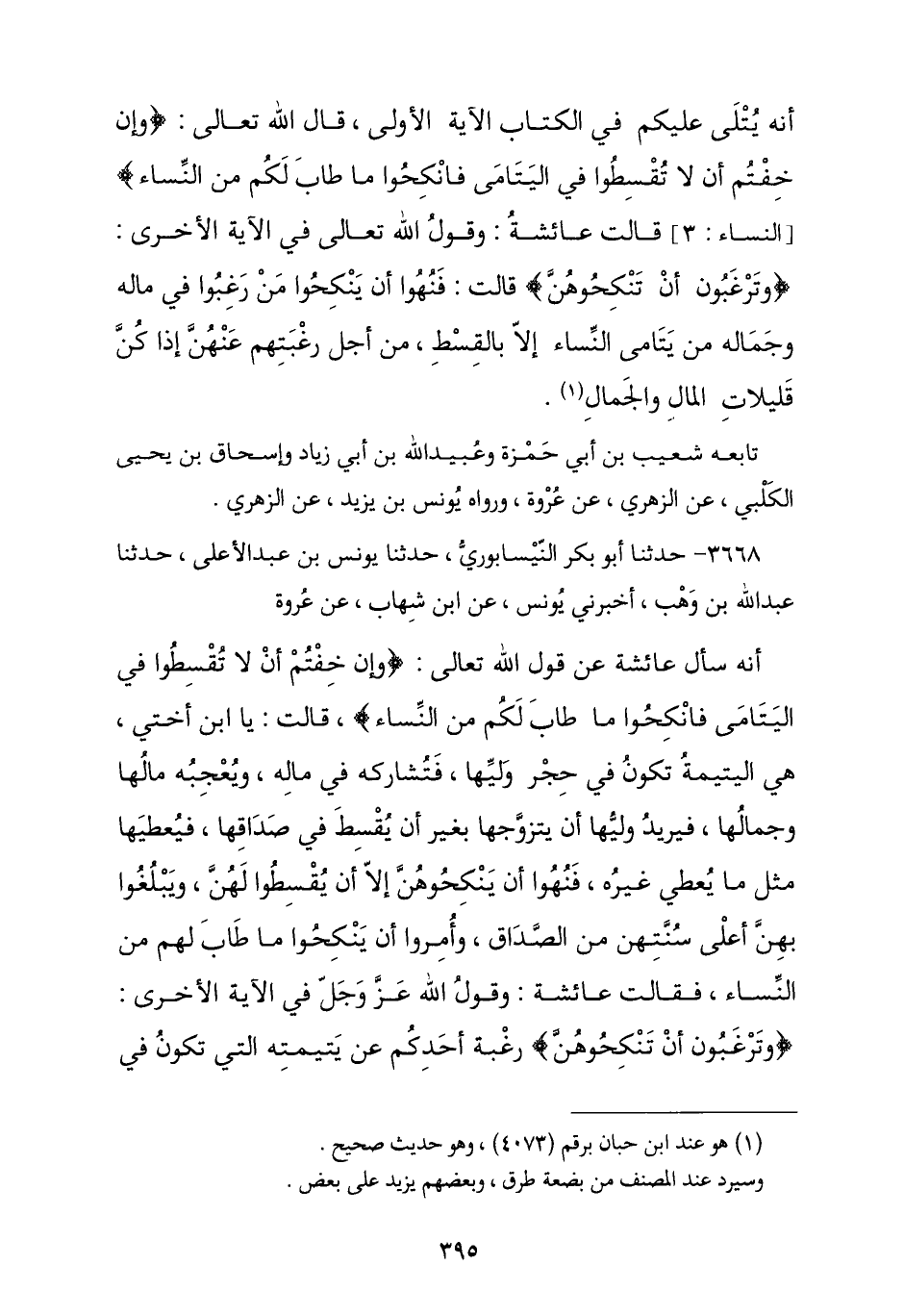 3668 - نا أَبُو بَكْرٍ النَّيْسَابُورِيُّ , نا يُونُسُ بْنُ عَبْدِ الْأَعْلَى , نا عَبْدُ اللَّهِ بْنُ وَهْبٍ , أَخْبَرَنِي يُونُسُ , عَنِ ابْنِ شِهَابٍ , أَخْبَرَنِي عُرْوَةُ , أَنَّهُ سَأَلَ عَائِشَةَ رَضِيَ اللَّهُ عَنْهَا عَنْ قَوْلِ اللَّهِ تَعَالَى عَزَّ وَجَلَّ {وَإِنْ خِفْتُمْ أَلَّا تُقْسِطُوا فِي الْيَتَامَى فَانْكِحُوا مَا طَابَ لَكُمْ مِنَ النِّسَاءِ مَثْنَى} [النساء: 3] , قَالَتْ: «يَا ابْنَ أُخْتِي §هِيَ الْيَتِيمَةُ تَكُونُ فِي حَجْرِ وَلِيِّهَا فَتُشَارِكُهُ فِي مَالِهِ وَيُعْجِبُهُ مَالُهَا وَجَمَالُهَا فَيُرِيدُ وَلِيُّهَا أَنْ يَتَزَوَّجَهَا بِغَيْرِ أَنْ يُقْسِطَ فِي صَدَاقِهَا فَيُعْطِيهَا مِثْلَ مَا يُعْطَى غَيْرُهُ , فَنُهُوا أَنْ يَنْكِحُوهُنَّ إِلَّا أَنْ يُقْسِطُوا لَهُنَّ وَيَبْلُغُوا لَهُنَّ أَعْلَى سُنَّتِهِنَّ مِنَ الصَّدَاقِ وَأُمِرُوا أَنْ يَنْكِحُوا مَا طَابَ لَهُمْ مِنَ النِّسَاءِ» , فَقَالَتْ عَائِشَةُ رَضِيَ اللَّهُ عَنْهَا: " وَقَوْلُ اللَّهِ عَزَّ وَجَلَّ فِي الْآيَةِ الْأُخْرَى {وَتَرْغَبُونَ أَنْ تَنْكِحُوهُنَّ} [النساء: 127] رَغْبَةُ أَحَدِكُمْ عَنْ يَتِيمَتِهِ الَّتِي تَكُونُ فِي -[396]- حِجْرِهِ تَكُونُ قَلِيلَةَ الْمَالِ وَالْجَمَالِ فَنُهُوا أَنْ يَنْكِحُوا مَا رَغِبُوا فِي مَالِهَا وَجَمَالِهَا فِي يَتَامَى النِّسَاءِ إِلَّا بِالْقِسْطِ مِنْ أَجْلِ رَغْبَتِهِمْ عَنْهُنَّ "
