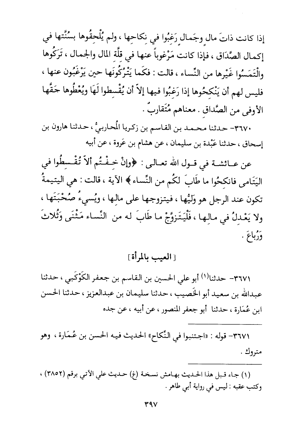 3670 - نا مُحَمَّدُ بْنُ الْقَاسِمِ بْنِ زَكَرِيَّا , نا هَارُونُ بْنُ إِسْحَاقَ , نا عَبْدَةُ بْنُ سُلَيْمَانَ , عَنْ هِشَامِ بْنِ عُرْوَةَ , عَنْ أَبِيهِ , عَنْ عَائِشَةَ , فِي قَوْلِ اللَّهِ تَعَالَى {وَإِنْ خِفْتُمْ أَلَا تُقْسِطُوا فِي الْيَتَامَى فَانْكِحُوا مَا طَابَ لَكُمْ مِنَ النِّسَاءِ} [النساء: 3] الْآيَةَ , قَالَتْ: § «هِيَ الْيَتِيمَةُ تَكُونُ عِنْدَ الرَّجُلِ هُوَ وَلِيُّهَا فَيَتَزَوَّجُهَا عَلَى مَالِهَا وَيُسِيءُ صُحْبَتَهَا وَلَا يَعْدِلُ فِي مَالِهَا فَلْيَتَزَوَّجْ مَا طَابَ لَهُ مِنَ النِّسَاءِ مَثْنَى وَثَلَاثَ وَرُبَاعَ»
