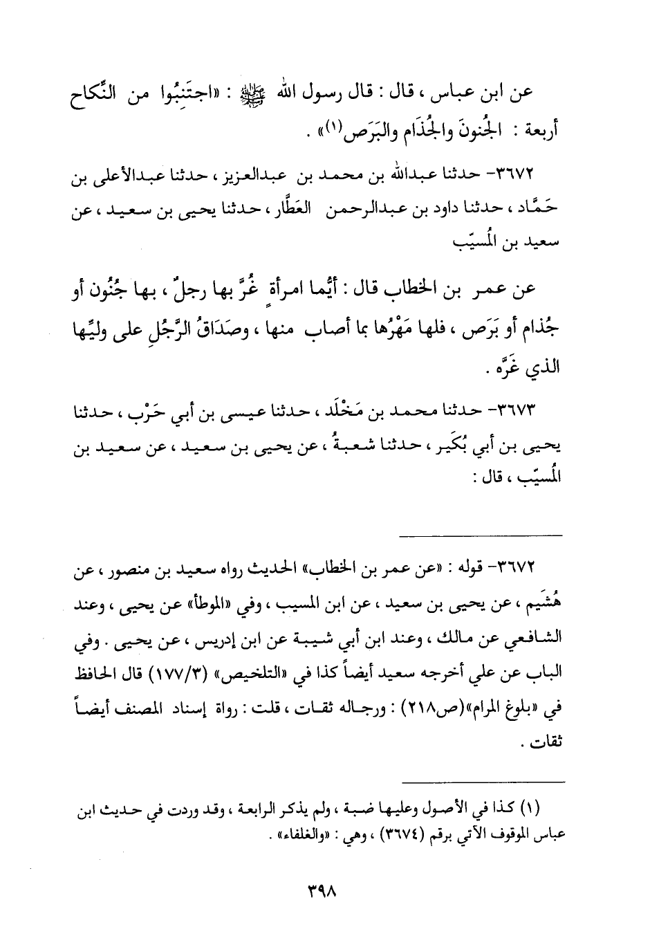 3672 - نا عَبْدُ اللَّهِ بْنُ مُحَمَّدِ بْنِ عَبْدِ الْعَزِيزِ , نا عَبْدُ الْأَعْلَى بْنُ حَمَّادٍ , نا دَاوُدُ بْنُ عَبْدِ الرَّحْمَنِ الْعَطَّارُ , نا يَحْيَى بْنُ سَعِيدٍ , عَنْ سَعِيدِ بْنِ الْمُسَيِّبِ , عَنْ عُمَرَ بْنِ الْخَطَّابِ , قَالَ: «أَيُّمَا §امْرَأَةٍ غُرَّ بِهَا رَجُلٌ بِهَا جُنُونٌ أَوْ جُذَامٌ أَوْ بَرَصٌ فَلَهَا مَهْرُهَا بِمَا أَصَابَ مِنْهَا , وَصَدَاقُ الرَّجُلِ عَلَى وَلِيِّهَا الَّذِي غَرَّهُ»