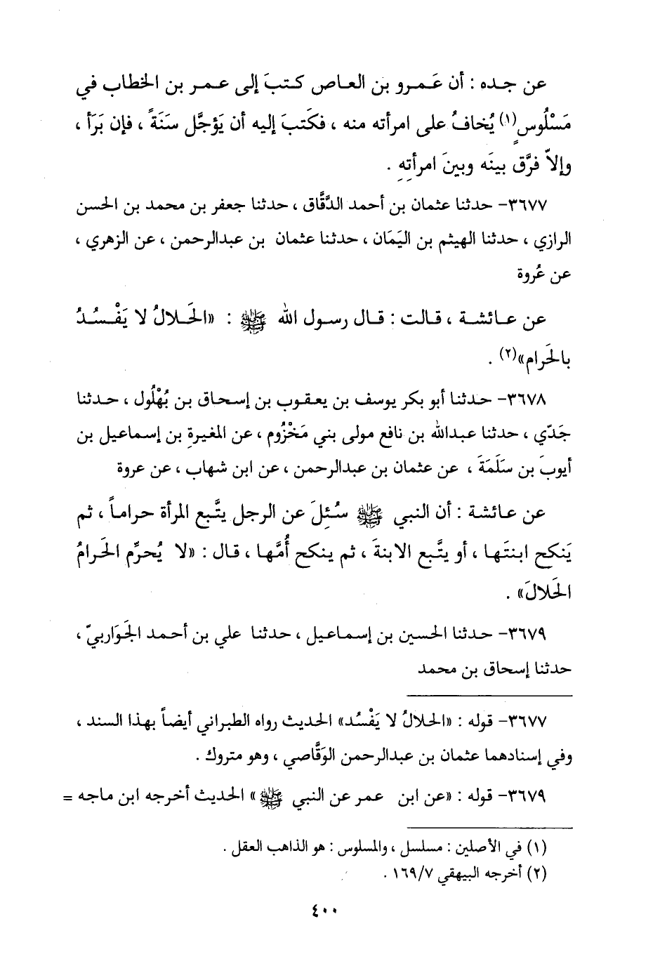3679 - نا الْحُسَيْنُ بْنُ إِسْمَاعِيلَ , نا عَلِيُّ بْنُ أَحْمَدَ الْجَوَارِبِيُّ , نا إِسْحَاقُ بْنُ مُحَمَّدٍ , -[401]- ح وَنا إِسْمَاعِيلُ بْنُ مُحَمَّدِ بْنِ صَالِحٍ , نا جَعْفَرُ بْنُ أَحْمَدَ بْنِ سَامٍ , نا إِسْحَاقُ بْنُ مُحَمَّدٍ الْفَرْوِيُّ , نا عَبْدُ اللَّهِ بْنُ عُمَرَ , عَنْ نَافِعٍ , عَنِ ابْنِ عُمَرَ , عَنِ النَّبِيِّ صَلَّى اللهُ عَلَيْهِ وَسَلَّمَ قَالَ: § «لَا يُحَرِّمُ الْحَرَامُ الْحَلَالَ»