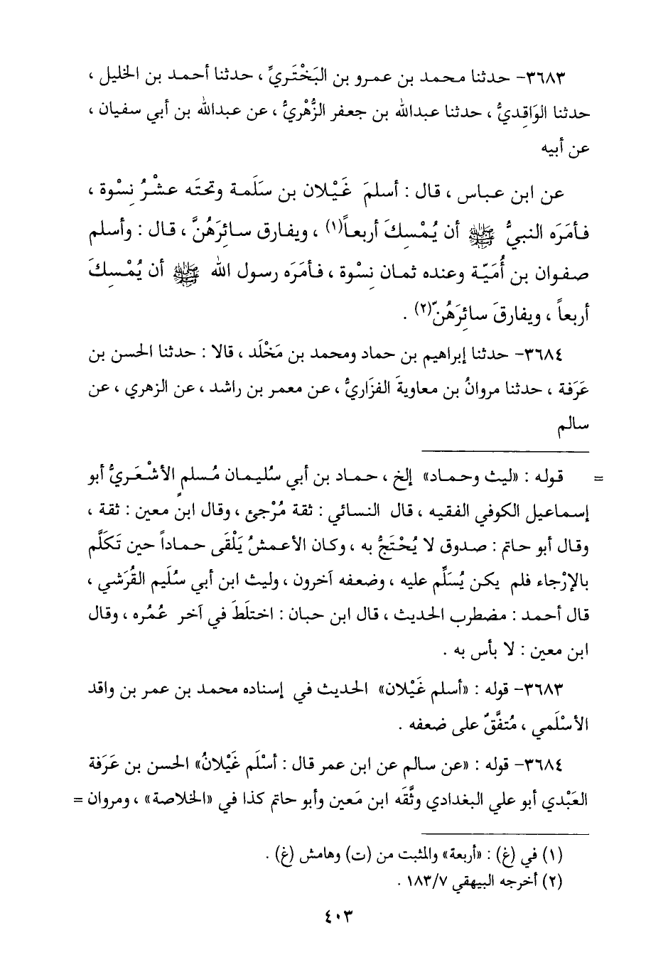 3683 - نا مُحَمَّدُ بْنُ عَمْرِو بْنِ الْبَخْتَرِيِّ , نا أَحْمَدُ بْنُ الْخَلِيلِ , نا الْوَاقِدِيُّ , نا عَبْدُ اللَّهِ بْنُ جَعْفَرٍ الزُّهْرِيُّ , عَنْ عَبْدِ اللَّهِ بْنِ أَبِي سُفْيَانَ , عَنْ أَبِيهِ , عَنِ ابْنِ عَبَّاسٍ , قَالَ: «أَسْلَمَ غَيْلَانُ بْنُ سَلَمَةَ وَتَحْتَهُ عَشْرُ نِسْوَةٍ , فَأَمَرَهُ النَّبِيُّ صَلَّى اللهُ عَلَيْهِ وَسَلَّمَ» أَنْ §يُمْسِكَ أَرْبَعًا وَيُفَارِقَ سَائِرَهُنَّ " , قَالَ: وَأَسْلَمَ صَفْوَانُ بْنُ أُمَيَّةَ وَعِنْدَهُ ثَمَانِ نِسْوَةٍ , فَأَمَرَهُ رَسُولُ اللَّهِ صَلَّى اللهُ عَلَيْهِ وَسَلَّمَ «أَنْ يُمْسِكَ أَرْبَعًا وَيُفَارِقَ سَائِرَهُنَّ»