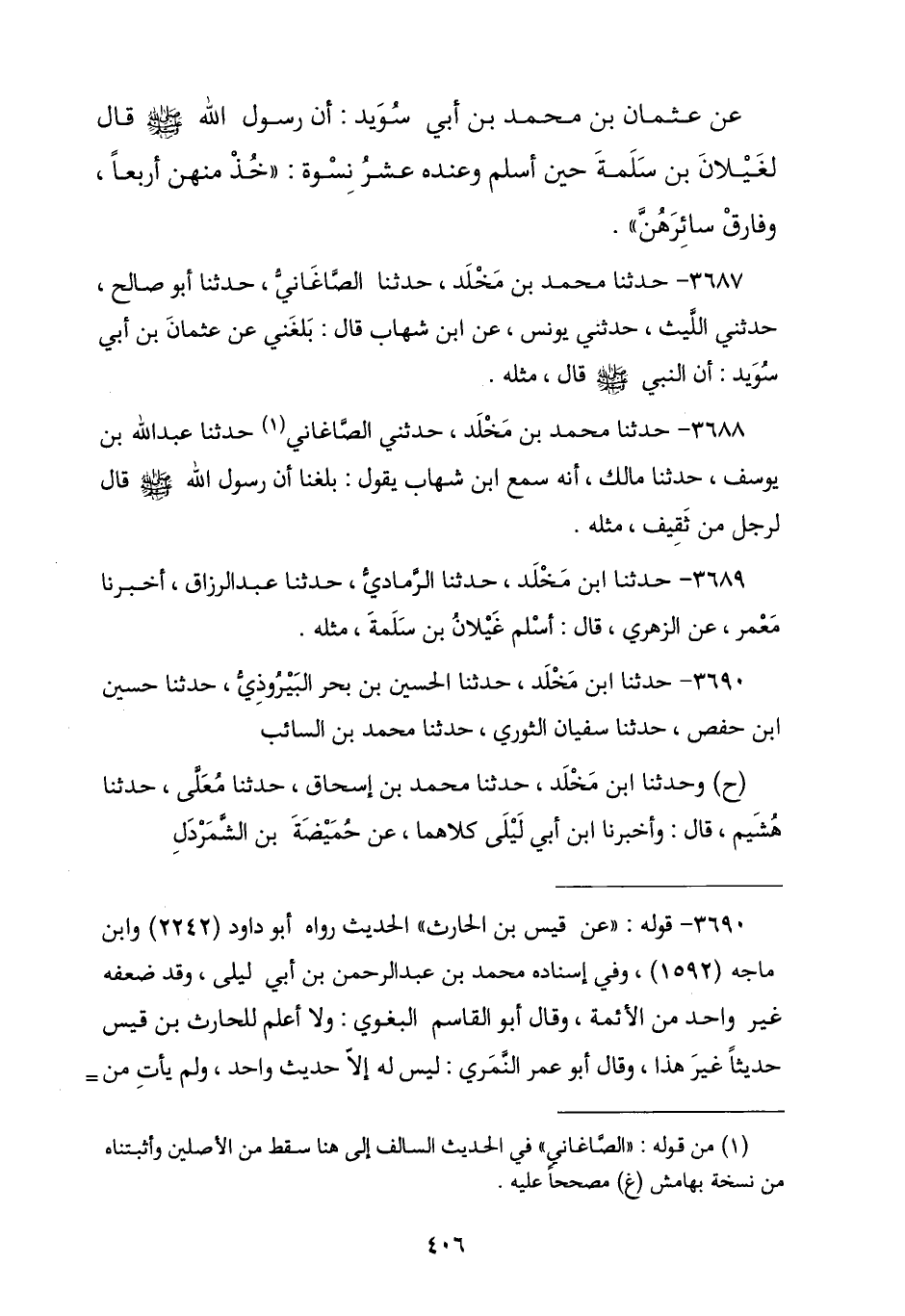 3690 - نا ابْنُ مَخْلَدٍ , نا الْحُسَيْنُ بْنُ بَحْرِ النَّيْرُوزِيُّ , نا حُسَيْنُ بْنُ حَفْصٍ , نا سُفْيَانُ الثَّوْرِيُّ , نا مُحَمَّدُ بْنُ السَّائِبِ , ح وَنا ابْنُ مَخْلَدٍ , نا مُحَمَّدُ بْنُ إِسْحَاقَ , نا مُعَلَّى , نا هُشَيْمٌ , قَالَ: وَأَنَا ابْنُ أَبِي لَيْلَى , كِلَاهُمَا عَنْ حُمَيْضَةَ بْنِ الشَّمَرْدَلِ , -[407]- عَنْ قَيْسِ بْنِ الْحَارِثِ , - وَفِي حَدِيثِ هُشَيْمٍ الْحَارِثِ بْنِ قَيْسٍ - أَنَّهُ أَسْلَمَ وَعِنْدَهُ ثَمَانِ نِسْوَةٍ , فَقَالَ لَهُ النَّبِيُّ صَلَّى اللهُ عَلَيْهِ وَسَلَّمَ: § «اخْتَرْ مِنْهُنَّ أَرْبَعًا»