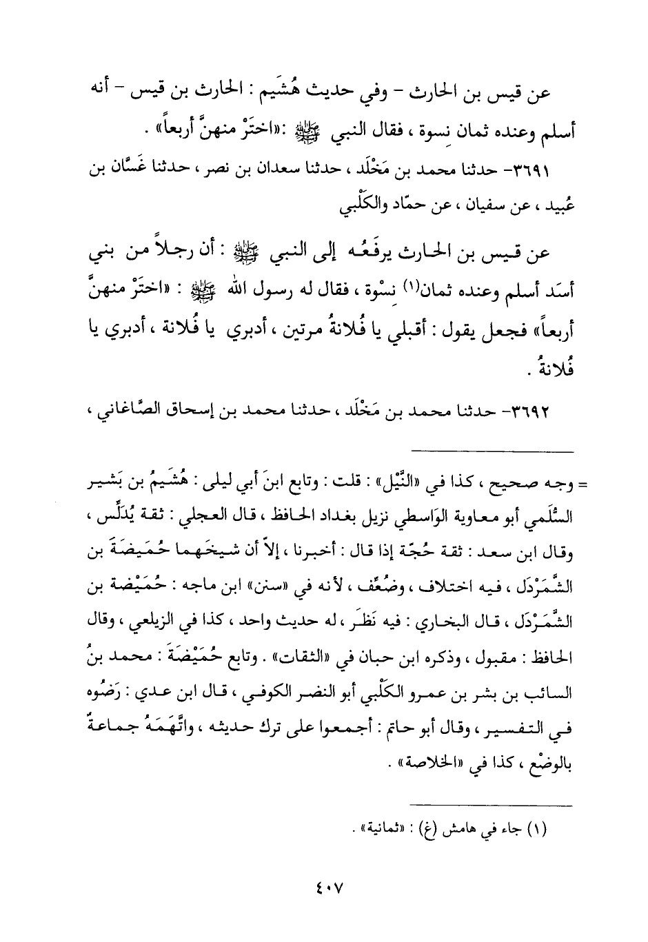 3692 - نا مُحَمَّدُ بْنُ مَخْلَدٍ , نا مُحَمَّدُ بْنُ إِسْحَاقَ الصَّاغَانِيُّ , -[408]- نا مُعَلَّى بْنُ مَنْصُورٍ , أنا هُشَيْمٌ , أنا مُغِيرَةُ , عَنْ رَجُلٍ مِنْ وَلَدِ الْحَارِثِ , أَنَّ الْحَارِثَ بْنَ قَيْسٍ الْأَسَدِيَّ أَسْلَمَ وَعِنْدَهُ ثَمَانِ نِسْوَةٍ , فَأَمَرَهُ النَّبِيُّ صَلَّى اللهُ عَلَيْهِ وَسَلَّمَ «أَنْ §يَخْتَارَ مِنْهُنَّ أَرْبَعًا»