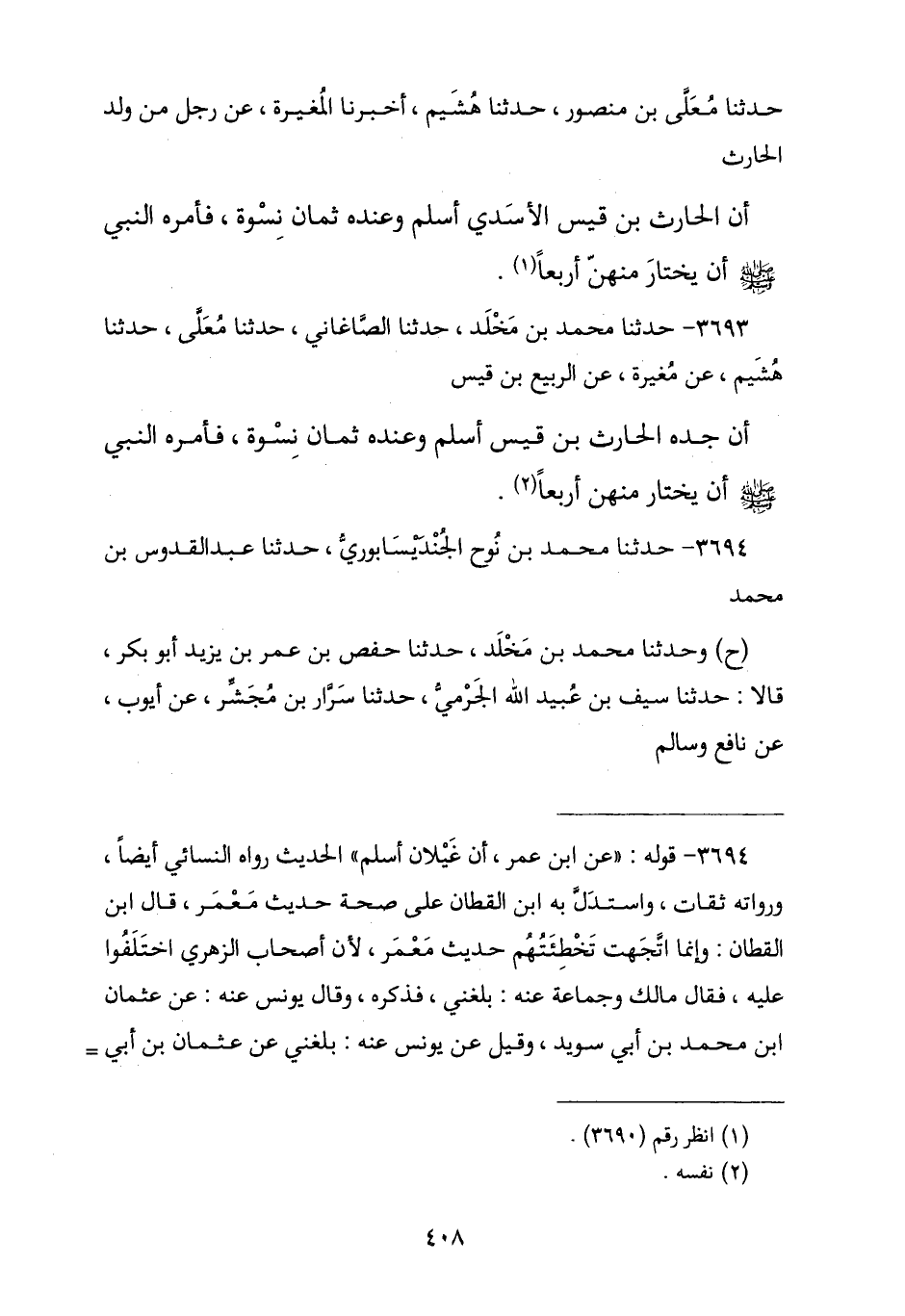 3693 - نا مُحَمَّدُ بْنُ مَخْلَدٍ , نا الصَّاغَانِيُّ , نا مُعَلَّى , نا هُشَيْمٌ , عَنْ مُغِيرَةَ , عَنِ الرَّبِيعِ بْنِ قَيْسٍ , أَنَّ جَدَّهُ الْحَارِثَ بْنَ قَيْسٍ أَسْلَمَ وَعِنْدَهُ ثَمَانِ نِسْوَةٍ , فَأَمَرَهُ النَّبِيُّ صَلَّى اللهُ عَلَيْهِ وَسَلَّمَ «أَنْ §يَخْتَارَ مِنْهُنَّ أَرْبَعًا»