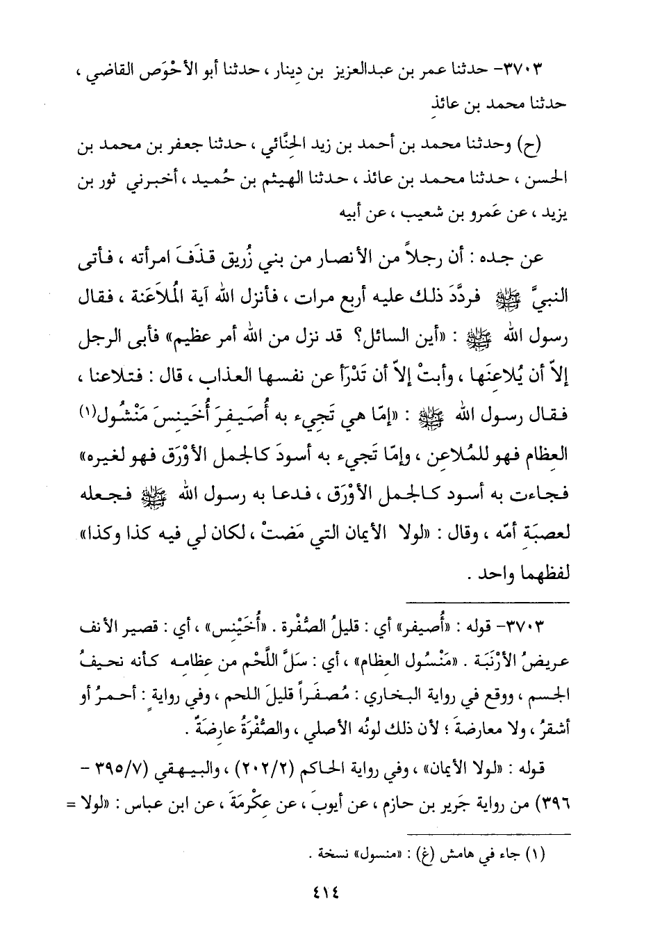 3703 - نا عُمَرُ بْنُ عَبْدِ الْعَزِيزِ بْنِ دِينَارٍ , نا أَبُو الْأَحْوَصِ الْقَاضِي , نا مُحَمَّدُ بْنُ عَائِذٍ , وَنا مُحَمَّدُ بْنُ أَحْمَدَ الْحِنَّائِيُّ , نا جَعْفَرُ بْنُ مُحَمَّدِ بْنِ الْحَسَنِ , نا مُحَمَّدُ بْنُ عَائِذٍ , نا الْهَيْثَمُ بْنُ حُمَيْدٍ , أَخْبَرَنِي ثَوْرُ بْنُ يَزِيدَ , عَنْ عَمْرِو بْنِ شُعَيْبٍ , عَنْ أَبِيهِ , عَنْ جَدِّهِ , أَنَّ رَجُلًا مِنَ الْأَنْصَارِ مِنْ بَنِي زُرَيْقٍ قَذَفَ امْرَأَتَهُ فَأَتَى النَّبِيَّ صَلَّى اللهُ عَلَيْهِ وَسَلَّمَ فَرَدَّدَ ذَلِكَ عَلَيْهِ أَرْبَعَ مَرَّاتٍ فَأَنْزَلَ اللَّهُ آيَةَ الْمُلَاعَنَةِ , فَقَالَ رَسُولُ اللَّهِ صَلَّى اللهُ عَلَيْهِ وَسَلَّمَ: «أَيْنَ السَّائِلُ قَدْ نَزَلَ مِنَ اللَّهِ أَمْرٌ عَظِيمٌ» , §فَأَبَى الرَّجُلُ إِلَّا أَنْ يُلَاعِنَهَا , وَأَبَتْ إِلَّا أَنْ تَدْرَأَ عَنْ نَفْسِهَا الْعَذَابَ , فَتَلَاعَنَا فَقَالَ رَسُولُ اللَّهِ صَلَّى اللهُ عَلَيْهِ وَسَلَّمَ: «أَمَّا هِيَ تَجِيءُ بِهِ أُصَيْفِرَ أُخَيْنِسَ مَنْسُولَ الْعِظَامِ فَهُوَ لِلْمُلَاعِنْ , وَأَمَّا تَجِيءُ بِهِ أَسْوَدَ كَالْجَمَلِ الْأَوْرَقِ فَهُوَ لِغَيْرِهِ» , فَجَاءَتْ بِهِ أَسْوَدَ كَالْجَمَلِ الْأَوْرَقِ , فَدَعَا بِهِ رَسُولُ اللَّهِ صَلَّى اللهُ عَلَيْهِ وَسَلَّمَ فَجَعَلَهُ لِعَصَبَةِ أُمِّهِ , وَقَالَ: «لَوْلَا الْأَيْمَانُ الَّتِي مَضَتْ لَكَانَ لِي فِيهِ كَذَا وَكَذَا» لَفْظُهُمَا وَاحِدٌ