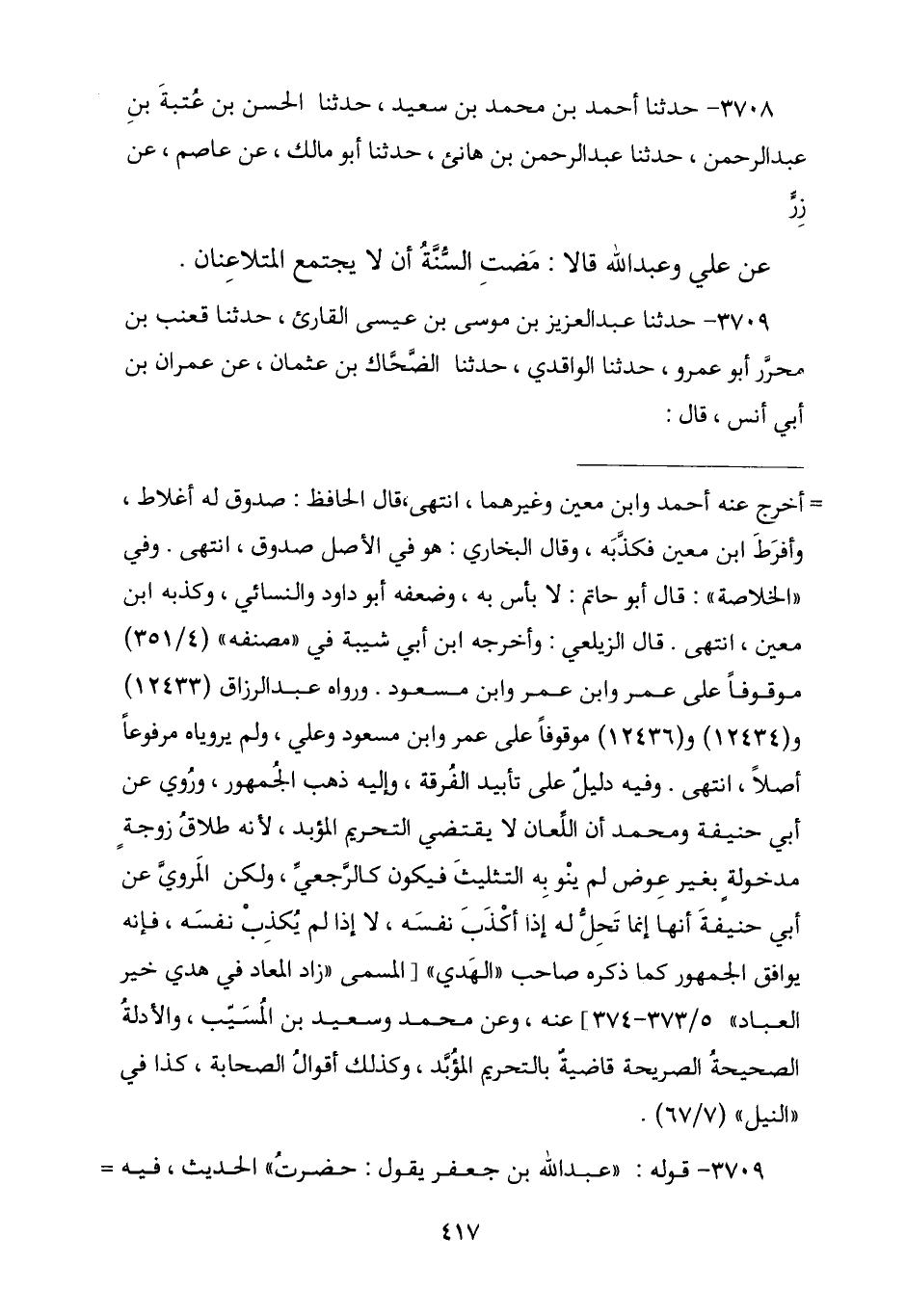 3708 - نا أَحْمَدُ بْنُ مُحَمَّدِ بْنِ سَعِيدٍ , نا الْحَسَنُ بْنُ عُتْبَةَ بْنِ عَبْدِ الرَّحْمَنِ , نا عَبْدُ الرَّحْمَنِ بْنُ هَانِئٍ , نا أَبُو مَالِكٍ , عَنْ عَاصِمٍ , عَنْ زِرٍّ , عَنْ عَلِيٍّ , وَعَبْدِ اللَّهِ , قَالَا: «مَضَتِ السُّنَّةُ §أَنْ لَا يَجْتَمِعَ الْمُتَلَاعِنَانِ»