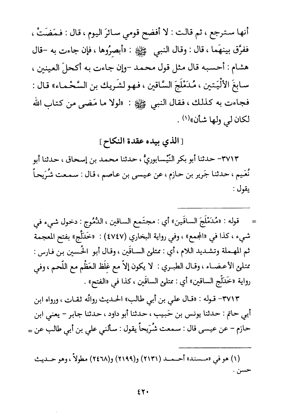 3713 - نا أَبُو بَكْرٍ النَّيْسَابُورِيُّ , نا مُحَمَّدُ بْنُ إِسْحَاقَ , نا أَبُو نُعَيْمٍ , نا جَرِيرُ بْنُ حَازِمٍ , عَنْ عِيسَى بْنِ عَاصِمٍ , قَالَ: سَمِعْتُ شُرَيْحًا , يَقُولُ: -[421]- قَالَ لِي عَلِيُّ بْنُ أَبِي طَالِبٍ: «§الَّذِي بِيَدِهِ عُقْدَةُ النِّكَاحِ؟» قُلْتُ: وَلِيُّ الْمَرْأَةِ , قَالَ: «لَا بَلْ هُوَ الزَّوْجُ»