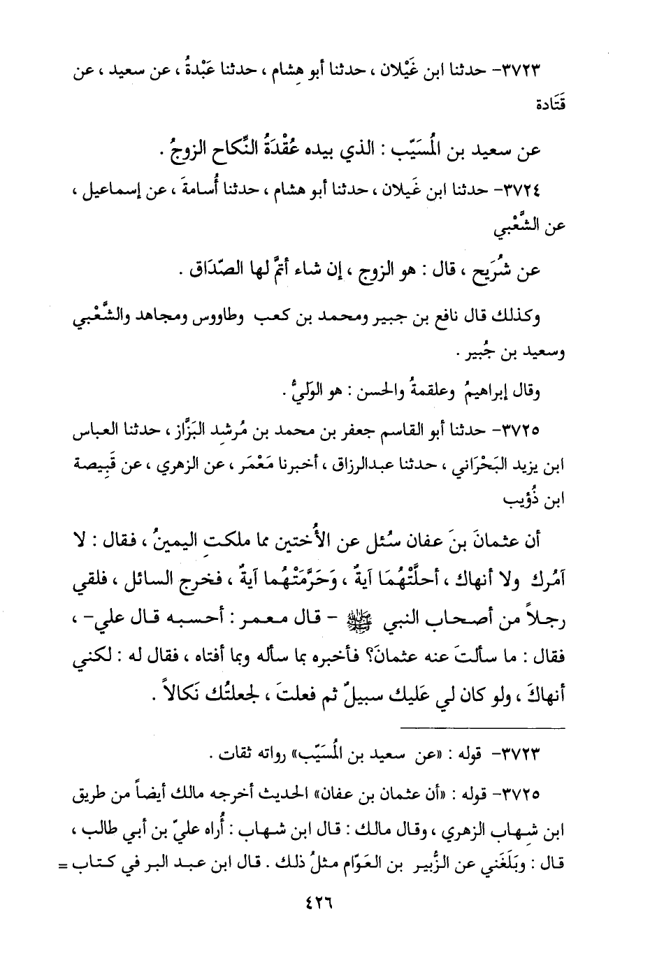3725 - نا أَبُو الْقَاسِمِ جَعْفَرُ بْنُ مُحَمَّدِ بْنِ مُرْشِدٍ الْبَزَّارُ , نا الْعَبَّاسُ بْنُ يَزِيدَ الْبَحْرَانِيُّ , نا عَبْدُ الرَّزَّاقِ , أنا مَعْمَرٌ , عَنِ الزُّهْرِيِّ , عَنْ قَبِيصَةَ بْنِ ذُؤَيْبٍ , أَنَّ عُثْمَانَ بْنَ عَفَّانَ سُئِلَ عَنِ §الْأُخْتَيْنِ مِمَّا مَلَكَتِ الْيَمِينِ , فَقَالَ: «لَا آمُرُكَ وَلَا أَنْهَاكَ أَحَلَّتْهُمَا آيَةٌ وَحَرَّمَتْهُمَا آيَةٌ» , فَخَرَجَ السَّائِلُ فَلَقِيَ رَجُلًا مِنْ أَصْحَابِ رَسُولِ اللَّهِ صَلَّى اللهُ عَلَيْهِ وَسَلَّمَ " , قَالَ مَعْمَرٌ: أَحْسَبُهُ قَالَ: عَلِيٌّ فَقَالَ: مَا سَأَلْتَ عَنْهُ عُثْمَانَ , فَأَخْبَرَهُ بِمَا سَأَلَهُ وَبِمَا أَفْتَاهُ فَقَالَ لَهُ: «لَكِنِّي أَنْهَاكَ وَلَوْ كَانَ لِي عَلَيْكَ سَبِيلٌ ثُمَّ فَعَلْتَ لَجَعَلْتُكَ نَكَالًا»