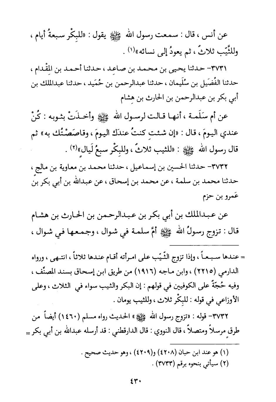 3731 - نا يَحْيَى بْنُ مُحَمَّدِ بْنِ صَاعِدٍ , نا أَحْمَدُ بْنُ الْمِقْدَامِ , نا الْفُضَيْلُ بْنُ سُلَيْمَانَ , نا عَبْدُ الرَّحْمَنِ بْنُ حُمَيْدٍ , نا عَبْدُ الْمَلِكِ بْنُ أَبِي بَكْرِ بْنِ عَبْدِ الرَّحْمَنِ بْنِ الْحَارِثِ بْنِ هِشَامٍ , عَنْ أُمِّ سَلَمَةَ , أَنَّهَا قَالَتْ لِرَسُولِ اللَّهِ صَلَّى اللهُ عَلَيْهِ وَسَلَّمَ وَأَخَذَتْ بِثَوْبِهِ: كُنْ عِنْدِي الْيَوْمَ , فَقَالَ: «إِنْ شِئْتِ كُنْتُ عِنْدَكِ الْيَوْمَ وَقَاصَصْتُكِ» , ثُمَّ قَالَ رَسُولُ اللَّهِ صَلَّى اللهُ عَلَيْهِ وَسَلَّمَ: § «لِلثَّيِّبِ ثَلَاثٌ , وَلِلْبِكْرِ سَبْعُ لَيَالٍ»