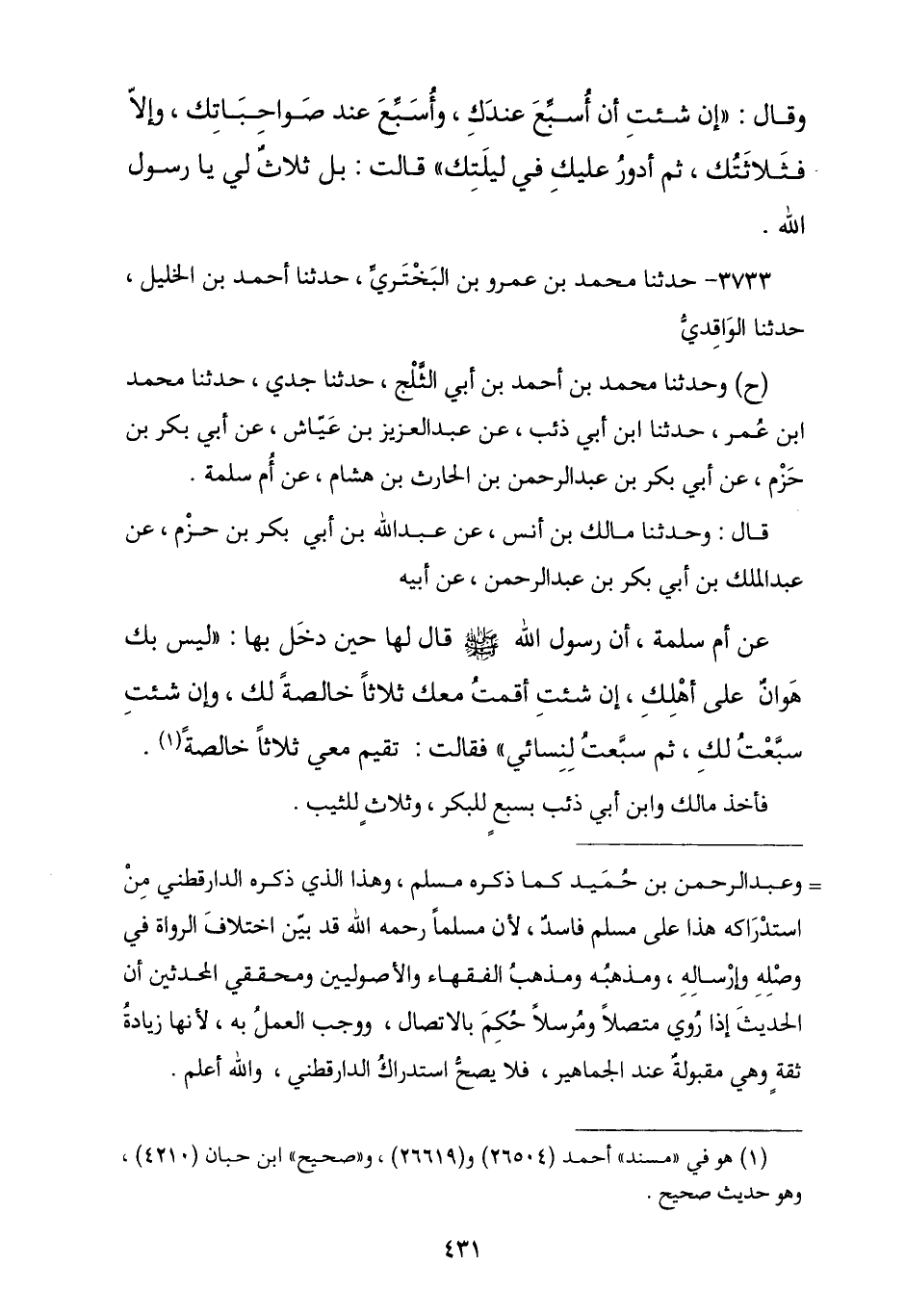 3733 - نا مُحَمَّدُ بْنُ عَمْرِو بْنِ الْبَخْتَرِيِّ , نا أَحْمَدُ بْنُ الْخَلِيلِ , نا الْوَاقِدِيُّ , ح وَنا مُحَمَّدُ بْنُ أَحْمَدَ بْنِ أَبِي الثَّلْجِ , نا جَدِّي , نا مُحَمَّدُ بْنُ عُمَرَ , نا ابْنُ أَبِي ذِئْبٍ , عَنْ عَبْدِ الْعَزِيزِ بْنِ عَيَّاشٍ , عَنْ أَبِي بَكْرِ بْنِ حَزْمٍ , عَنْ أَبِي بَكْرِ بْنِ عَبْدِ الرَّحْمَنِ بْنِ الْحَارِثِ بْنِ هِشَامٍ , عَنْ أُمِّ سَلَمَةَ , قَالَ: وَنا مَالِكُ بْنُ أَنَسٍ , عَنْ عَبْدِ اللَّهِ بْنِ أَبِي بَكْرِ بْنِ حَزْمٍ , عَنْ عَبْدِ الْمَلِكِ بْنِ أَبِي بَكْرِ بْنِ عَبْدِ الرَّحْمَنِ بْنِ الْحَارِثِ بْنِ هِشَامٍ , عَنْ أَبِيهِ , عَنْ أُمِّ سَلَمَةَ , أَنَّ رَسُولَ اللَّهِ صَلَّى اللهُ عَلَيْهِ وَسَلَّمَ قَالَ لَهَا حِينَ دَخَلَ بِهَا: § «لَيْسَ بِكِ هَوَانٌ عَلَى أَهْلِكِ إِنْ شِئْتِ أَقَمْتُ مَعَكِ ثَلَاثًا خَالِصَةً لَكِ , وَإِنْ شِئْتِ سَبَّعْتُ لَكِ ثُمَّ سَبَّعْتُ لِنِسَائِي» , فَقَالَتْ تُقِيمُ مَعِي ثَلَاثًا خَالِصَةً. فَأَخَذَ مَالِكٌ وَابْنُ أَبِي ذِئْبٍ «بِسَبْعٍ لِلْبِكْرِ , وَبِثَلَاثٍ لِلثَّيِّبِ»