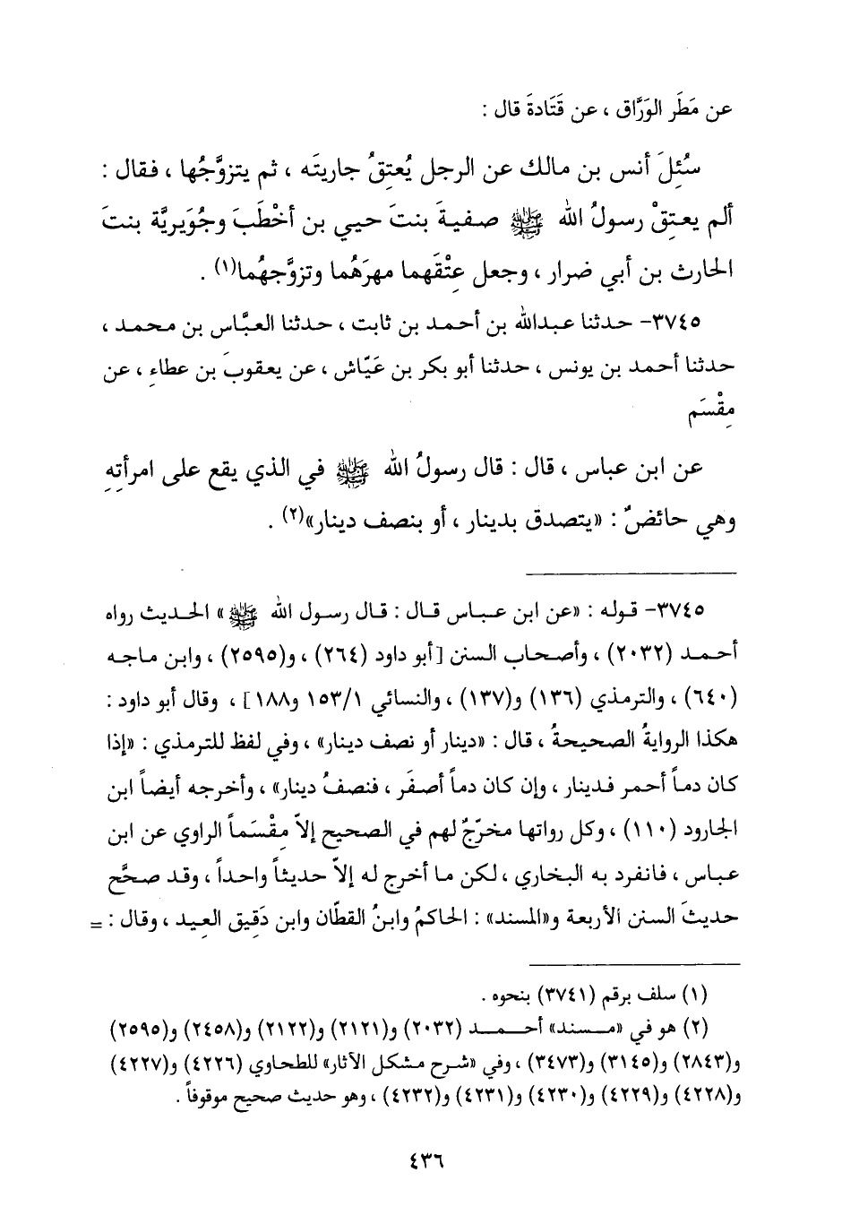 3745 - نا عَبْدُ اللَّهِ بْنُ أَحْمَدَ بْنِ ثَابِتٍ , نا الْعَبَّاسُ بْنُ مُحَمَّدٍ , نا أَحْمَدُ بْنُ يُونُسَ , نا أَبُو بَكْرِ بْنُ عَيَّاشٍ , عَنْ يَعْقُوبَ بْنِ عَطَاءٍ , عَنْ مِقْسَمٍ , عَنِ ابْنِ عَبَّاسٍ , قَالَ: قَالَ رَسُولُ اللَّهِ صَلَّى اللهُ عَلَيْهِ وَسَلَّمَ فِي الَّذِي يَقَعُ عَلَى امْرَأَتِهِ وَهِيَ حَائِضٌ , قَالَ: § «يَتَصَدَّقُ بِدِينَارٍ أَوْ بِنِصْفِ دِينَارٍ»