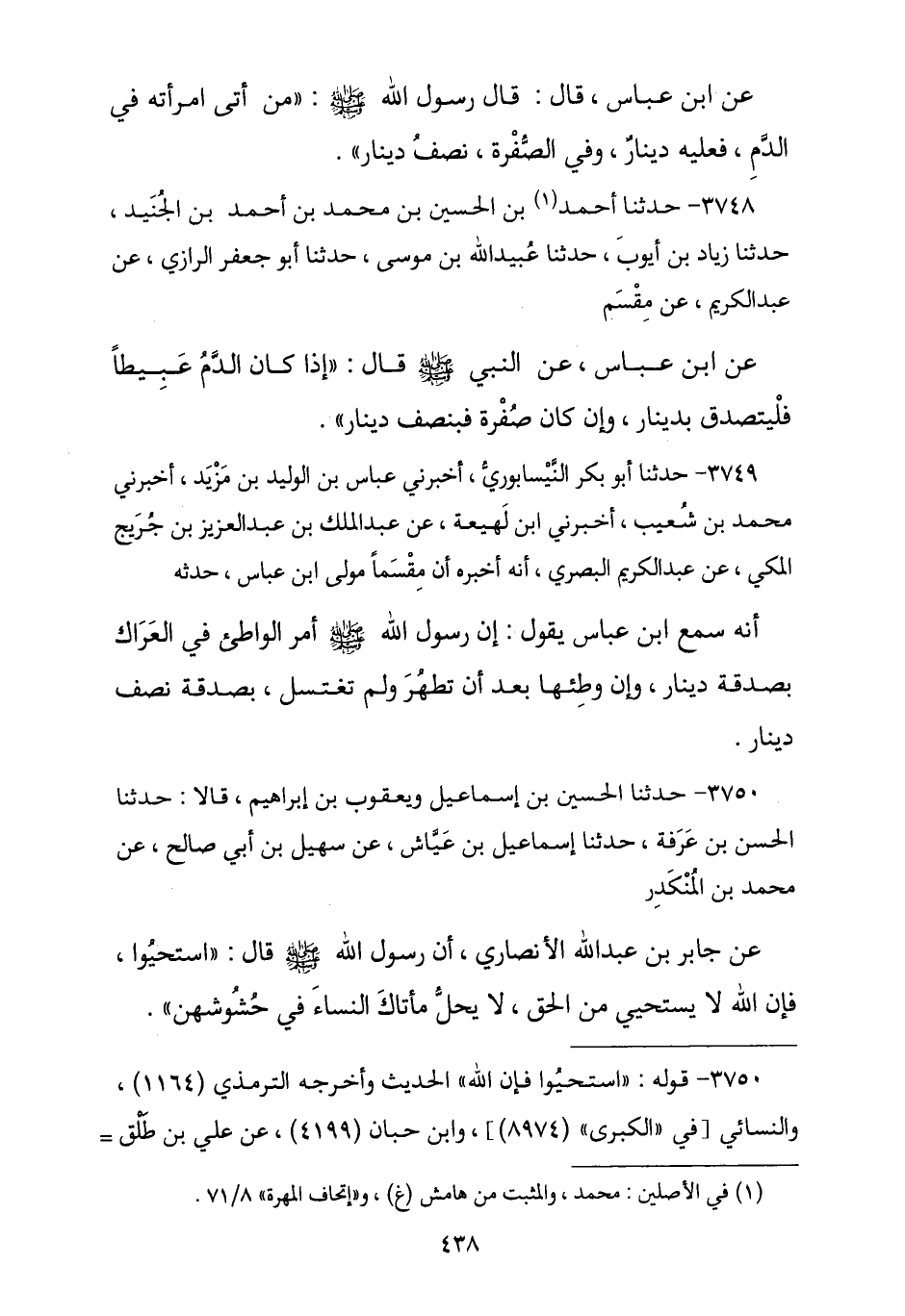 3750 - نا الْحُسَيْنُ بْنُ إِسْمَاعِيلَ , وَيَعْقُوبُ بْنُ إِبْرَاهِيمَ الْبَزَّارُ , قَالَا: نا الْحَسَنُ بْنُ عَرَفَةَ , نا إِسْمَاعِيلُ بْنُ عَيَّاشٍ , عَنْ سُهَيْلِ بْنِ أَبِي صَالِحٍ , عَنْ مُحَمَّدِ بْنِ الْمُنْكَدِرِ , عَنْ جَابِرِ بْنِ عَبْدِ اللَّهِ الْأَنْصَارِيِّ , أَنَّ رَسُولَ اللَّهِ صَلَّى اللهُ عَلَيْهِ وَسَلَّمَ قَالَ: § «اسْتَحْيُوا فَإِنَّ اللَّهَ لَا يَسْتَحِي مِنَ الْحَقِّ , لَا يَحِلُّ مَأْتَاكَ النِّسَاءَ فِي حُشُوشِهِنَّ»