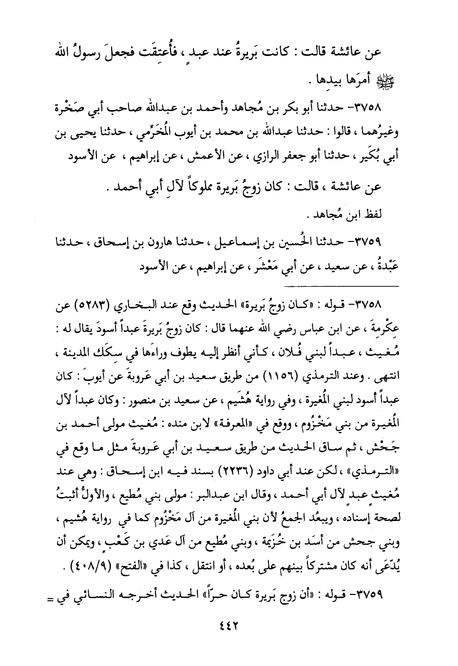 3758 - نا أَبُو بَكْرِ بْنُ مُجَاهِدٍ , وَأَحْمَدُ بْنُ عَبْدِ اللَّهِ صَاحِبُ أَبِي صَخْرَةَ وَغَيْرُهُمَا، قَالُوا: نا عَبْدُ اللَّهِ بْنُ أَيُّوبَ الْمَخْرَمِيُّ , نا يَحْيَى بْنُ أَبِي بُكَيْرٍ , نا أَبُو جَعْفَرٍ الرَّازِيُّ , عَنِ الْأَعْمَشِ , عَنْ إِبْرَاهِيمَ , عَنِ الْأَسْوَدِ , عَنْ عَائِشَةَ , قَالَتْ: «كَانَ §زَوْجُ بَرِيرَةَ مَمْلُوكًا لِآلِ أَبِي أَحْمَدَ» لَفْظُ ابْنِ مُجَاهِدٍ