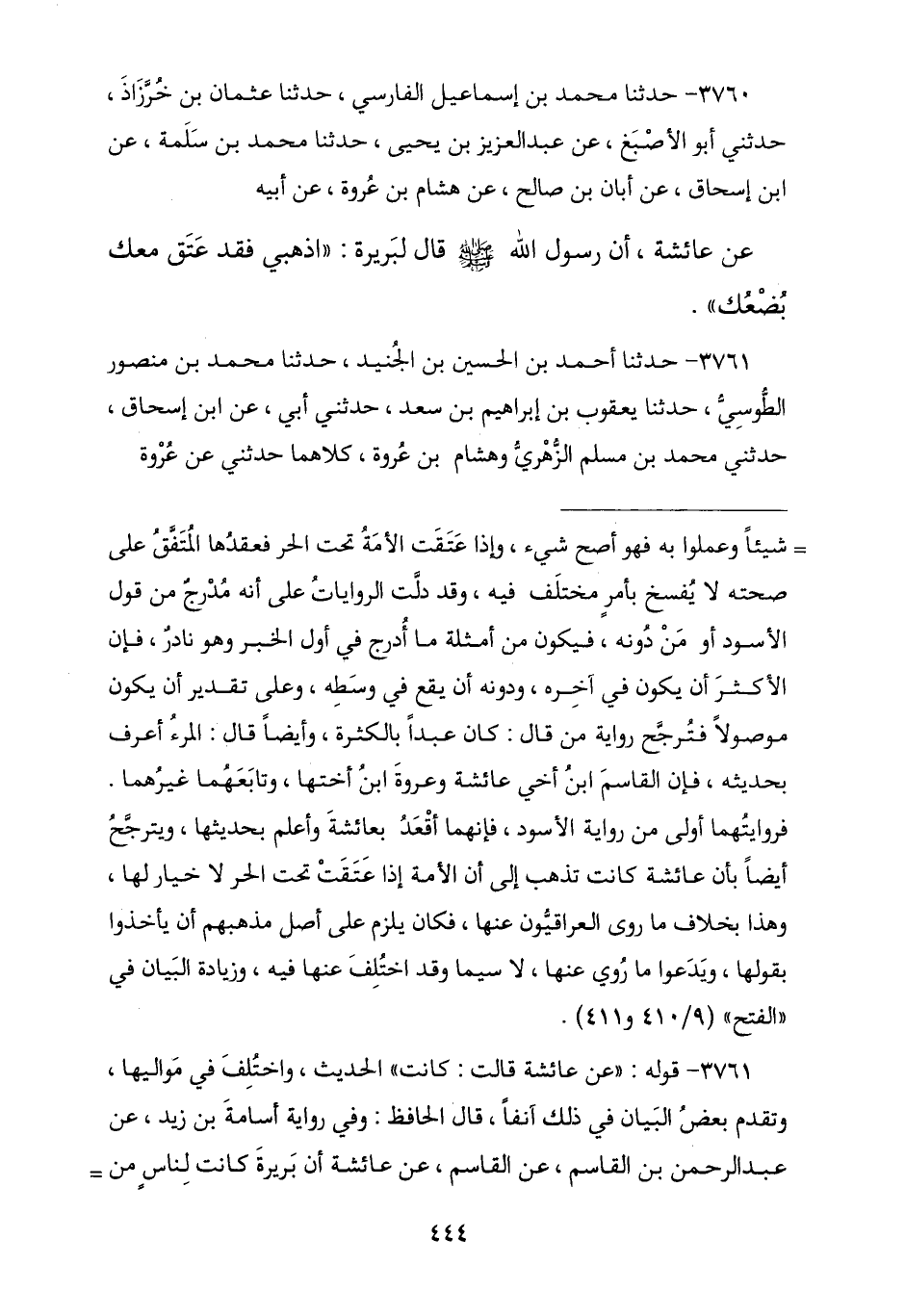 3761 - نا أَحْمَدُ بْنُ الْحُسَيْنِ بْنِ الْجُنَيْدِ , نا مُحَمَّدُ بْنُ مَنْصُورٍ الطُّوسِيُّ , نا يَعْقُوبُ بْنُ إِبْرَاهِيمَ بْنِ سَعْدٍ , حَدَّثَنِي أَبِي , عَنِ ابْنِ إِسْحَاقَ , حَدَّثَنِي مُحَمَّدُ بْنُ مُسْلِمٍ الزُّهْرِيُّ , وَهِشَامُ بْنُ عُرْوَةَ , كِلَاهُمَا حَدَّثَنِي عَنْ عُرْوَةَ , -[445]- عَنْ عَائِشَةَ , قَالَتْ: كَانَتْ بَرِيرَةُ عِنْدَ عَبْدٍ فَعُتِقَتْ , «فَجَعَلَ رَسُولُ اللَّهِ صَلَّى اللهُ عَلَيْهِ وَسَلَّمَ §أَمْرَهَا بِيَدِهَا»