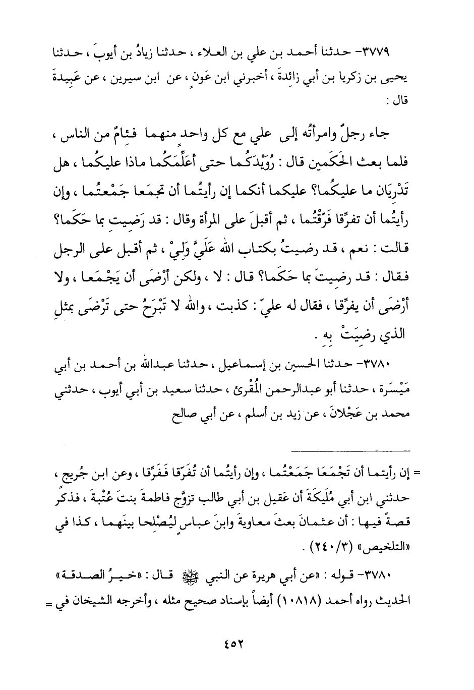 3779 - نا أَحْمَدُ بْنُ عَلِيِّ بْنِ الْعَلَاءِ , نا زِيَادُ بْنُ أَيُّوبَ , نا يَحْيَى بْنُ زَكَرِيَّا بْنِ أَبِي زَائِدَةَ , أَخْبَرَنِي ابْنُ عَوْنٍ , عَنِ ابْنِ سِيرِينَ , عَنْ عُبَيْدَةَ , قَالَ: جَاءَ رَجُلٌ وَامْرَأَتُهُ إِلَى عَلِيٍّ رَضِيَ اللَّهُ عَنْهُ مَعَ كُلِّ وَاحِدٍ مِنْهُمَا فِئَامٌ مِنَ النَّاسِ , فَلَمَّا بَعَثَ الْحَكَمَيْنِ قَالَ: «رُوَيْدَكُمَا حَتَّى أُعَلِّمَكُمَا مَاذَا عَلَيْكُمَا §هَلْ تَدْرِيَانِ مَا عَلَيْكُمَا؟ , إِنَّكُمَا إِنْ رَأَيْتُمَا أَنْ تَجْمَعَا جَمَعْتُمَا وَإِنْ رَأَيْتُمَا أَنْ تُفَرِّقَا فَرَّقْتُمَا» ثُمَّ أَقْبَلَ عَلَى الْمَرْأَةِ , وَقَالَ: «أَرَضِيتِ بِمَا حَكَمَا؟» , قَالَتْ: نَعَمْ قَدْ رَضِيتُ بِكِتَابِ اللَّهِ عَلَيَّ وَلِيَّ , ثُمَّ أَقْبَلَ عَلَى الرَّجُلِ , فَقَالَ: «قَدْ رَضِيتَ بِمَا حَكَمَا» , قَالَ: لَا وَلَكِنِّي أَرْضَى أَنْ يَجْمَعَا وَلَا أَرْضَى أَنْ يُفَرِّقَا , فَقَالَ لَهُ: «كَذَبْتَ وَاللَّهِ لَا تَبْرَحُ حَتَّى تَرْضَى بِمِثْلِ الَّذِي رَضِيَتْ بِهِ»