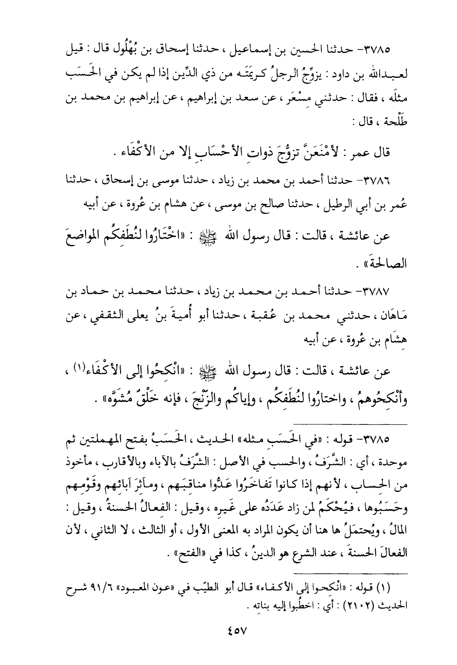 3785 - نا الْحُسَيْنُ بْنُ إِسْمَاعِيلَ , نا إِسْحَاقُ بْنُ بُهْلُولٍ , قَالَ: قِيلَ لِعَبْدِ اللَّهِ بْنِ أَبِي رَوَّادٍ: يُزَوِّجُ الرَّجُلُ كَرِيمَتَهُ مِنْ ذِي الدِّينِ إِذَا لَمْ يَكُنْ فِي الْحَسَبِ مِثْلُهُ؟ , قَالَ: حَدَّثَنِي مِسْعَرٌ , عَنْ سَعْدِ بْنِ إِبْرَاهِيمَ , عَنْ إِبْرَاهِيمَ بْنِ مُحَمَّدِ بْنِ طَلْحَةَ , قَالَ: قَالَ عُمَرُ: § «لَأَمْنَعَنَّ تَزَوُّجَ ذَاتِ الْأَحْسَابِ إِلَّا مِنَ الْأَكْفَاءِ»