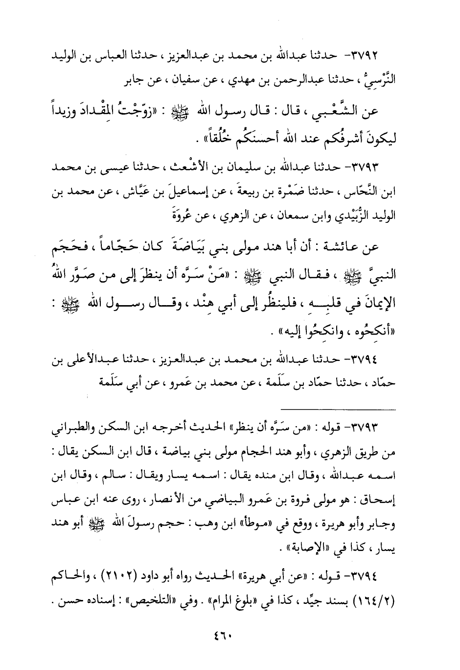 3793 - نا عَبْدُ اللَّهِ بْنُ سُلَيْمَانَ بْنِ الْأَشْعَثِ , نا عِيسَى بْنُ مُحَمَّدِ النَّحَّاسِ , نا ضَمْرَةُ بْنُ رَبِيعَةَ , عَنْ إِسْمَاعِيلَ بْنِ عَيَّاشٍ , عَنْ مُحَمَّدِ بْنِ الْوَلِيدِ الزُّبَيْدِيِّ , وَابْنِ سَمْعَانَ , عَنِ الزُّهْرِيِّ , عَنْ عُرْوَةَ , عَنْ عَائِشَةَ , أَنَّ أَبَا هِنْدَ مَوْلَى بَنِي بَيَاضَةَ كَانَ حَجَّامًا فَحَجَمَ النَّبِيَّ صَلَّى اللهُ عَلَيْهِ وَسَلَّمَ , فَقَالَ النَّبِيُّ صَلَّى اللهُ عَلَيْهِ وَسَلَّمَ: § «مَنْ سَرَّهُ أَنْ يَنْظُرَ إِلَى مَنْ صَوَّرَ اللَّهُ الْإِيمَانَ فِي قَلْبِهِ فَلْيَنْظُرْ إِلَى أَبِي هِنْدَ» , وَقَالَ رَسُولُ اللَّهِ صَلَّى اللهُ عَلَيْهِ وَسَلَّمَ: «أَنْكِحُوهُ وَأَنْكِحُوا إِلَيْهِ»