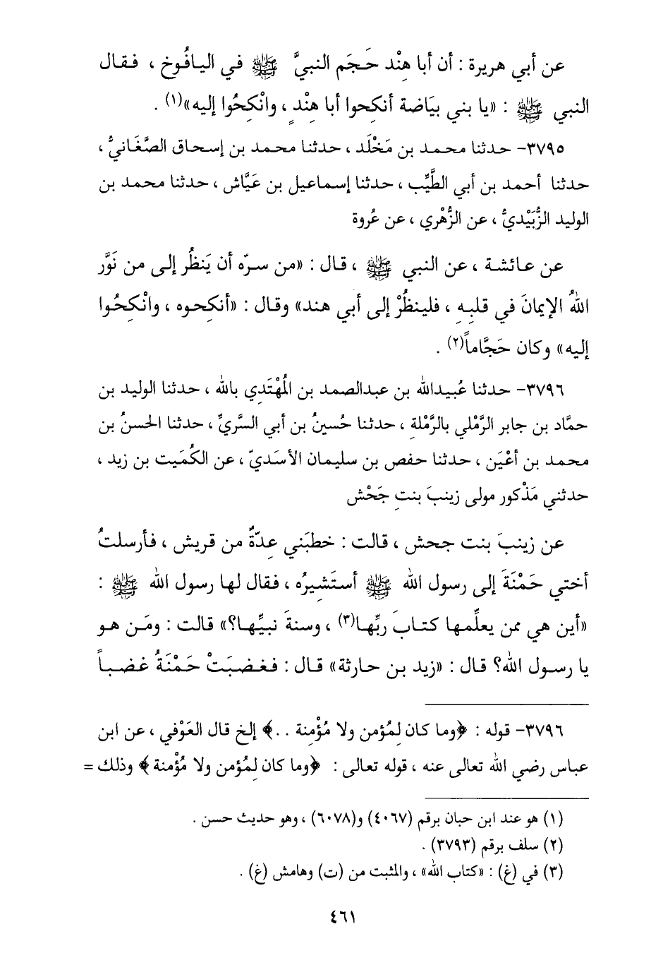 3795 - نا مُحَمَّدُ بْنُ مَخْلَدٍ , نا مُحَمَّدُ بْنُ إِسْحَاقَ الصَّغَانِيُّ , نا أَحْمَدُ بْنُ أَبِي الطَّيِّبِ , نا إِسْمَاعِيلُ بْنُ عَيَّاشٍ , نا مُحَمَّدُ بْنُ الْوَلِيدِ الزُّبَيْدِيُّ , عَنِ الزُّهْرِيِّ , عَنْ عُرْوَةَ , عَنْ عَائِشَةَ , عَنِ النَّبِيِّ صَلَّى اللهُ عَلَيْهِ وَسَلَّمَ , قَالَ: § «مَنْ سَرَّهُ أَنْ يَنْظُرَ إِلَى مَنْ نَوَّرَ اللَّهُ الْإِيمَانَ فِي قَلْبِهِ فَلْيَنْظُرْ إِلَى أَبِي هِنْدَ» , وَقَالَ: «أَنْكِحُوهُ وَأَنْكِحُوا إِلَيْهِ» وَكَانَ حَجَّامًا