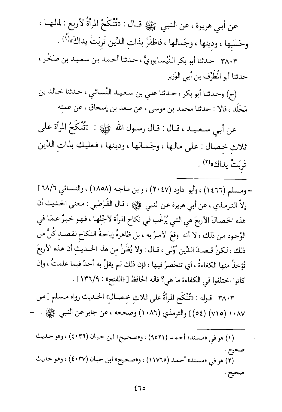 3803 - نا أَبُو بَكْرٍ النَّيْسَابُورِيُّ , نا أَحْمَدُ بْنُ سَعِيدِ بْنِ صَخْرٍ , نا أَبُو الْمُطَرِّفِ بْنُ أَبِي الْوَزِيرِ , ح وَنا أَبُو بَكْرٍ , نا عَلِيُّ بْنُ سَعِيدٍ النَّسَائِيُّ , نا خَالِدُ بْنُ مَخْلَدٍ , قَالَا: نا مُحَمَّدُ بْنُ مُوسَى , عَنْ سَعْدِ بْنِ إِسْحَاقَ , عَنْ عَمَّتِهِ , عَنْ أَبِي سَعِيدٍ , قَالَ: قَالَ رَسُولُ اللَّهِ صَلَّى اللهُ عَلَيْهِ وَسَلَّمَ: § «تُنْكَحُ الْمَرْأَةُ عَلَى ثَلَاثِ خِصَالٍ عَلَى مَالِهَا وَدِينِهَا وَجَمَالِهَا , فَعَلَيْكَ بِذَاتِ الدِّينِ تَرِبَتْ يَدَاكَ»