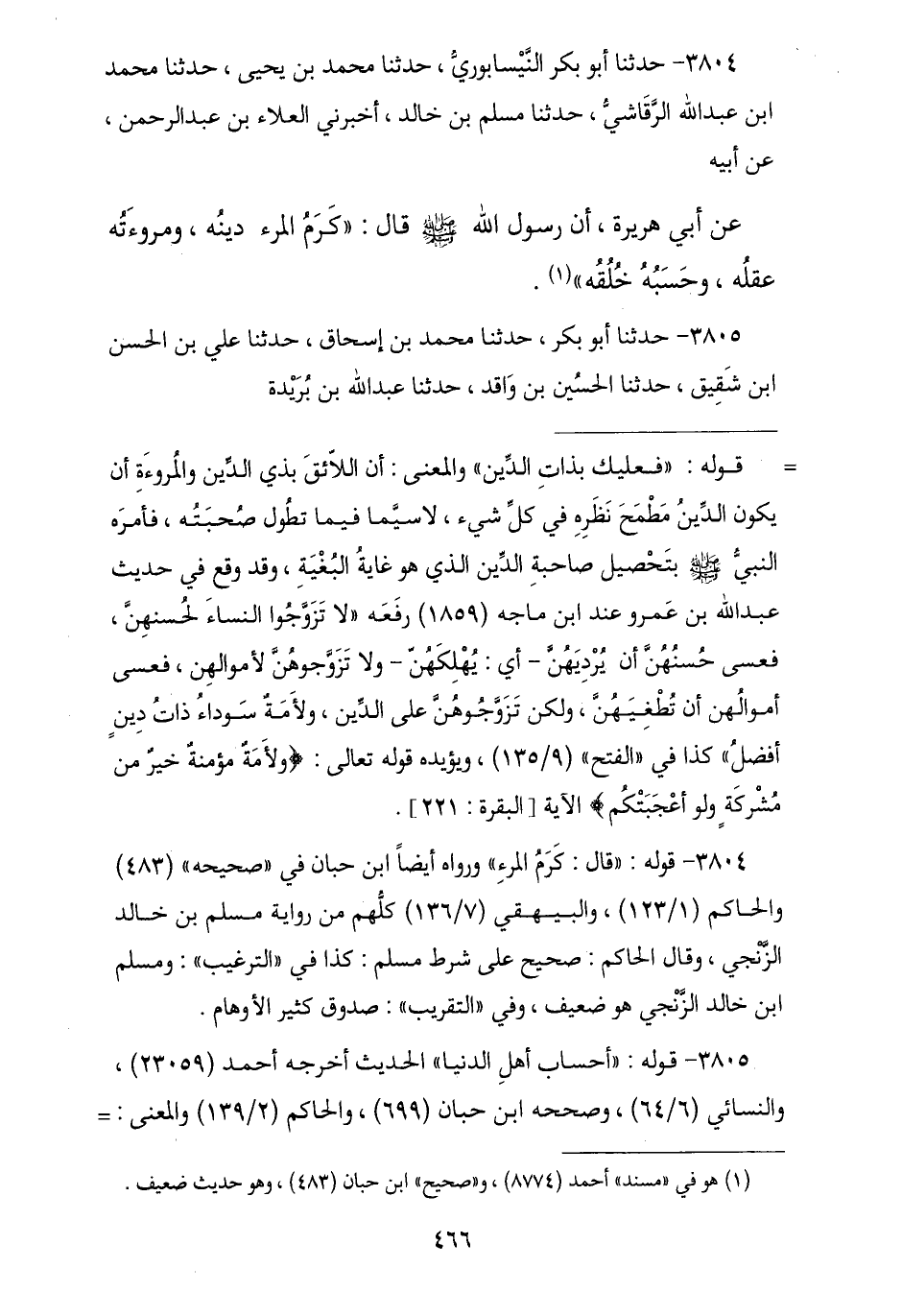 3804 - نا أَبُو بَكْرٍ النَّيْسَابُورِيُّ , نا مُحَمَّدُ بْنُ يَحْيَى , نا مُحَمَّدُ بْنُ عَبْدِ اللَّهِ الرَّقَاشِيُّ , نا مُسْلِمُ بْنُ خَالِدٍ , أَخْبَرَنِي الْعَلَاءُ بْنُ عَبْدِ الرَّحْمَنِ , عَنْ أَبِيهِ , عَنْ أَبِي هُرَيْرَةَ , أَنَّ رَسُولَ اللَّهِ صَلَّى اللهُ عَلَيْهِ وَسَلَّمَ , قَالَ: § «كَرَمُ الْمَرْءِ دِينُهُ , وَمُرُوءَتُهُ عَقْلُهُ , وَحَسَبُهُ خُلُقُهُ»