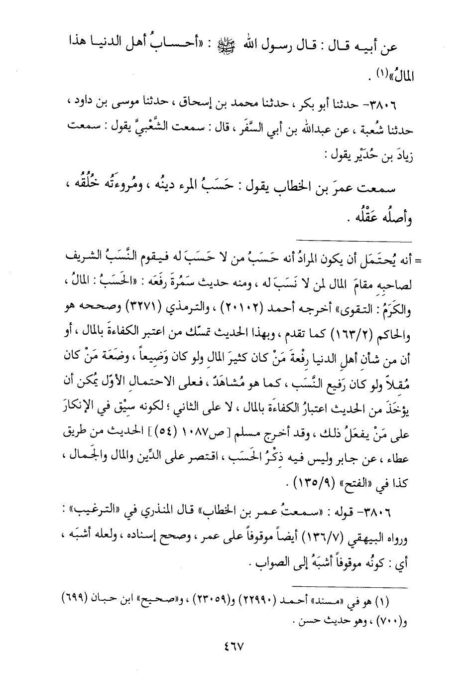 3806 - نا أَبُو بَكْرٍ , نا مُحَمَّدُ بْنُ إِسْحَاقَ , نا مُوسَى بْنُ دَاوُدَ , نا شُعْبَةُ , عَنْ عَبْدِ اللَّهِ بْنِ أَبِي السَّفَرِ , قَالَ: سَمِعْتُ الشَّعْبِيَّ , يَقُولُ: سَمِعْتُ زِيَادَ بْنَ حُدَيْرٍ , يَقُولُ: سَمِعْتُ عُمَرَ بْنَ الْخَطَّابِ , يَقُولُ: § «حَسَبُ الْمَرْءِ دِينُهُ , وَمُرُوءَتُهُ خُلُقُهُ , وَأَصْلُهُ عَقْلُهُ»