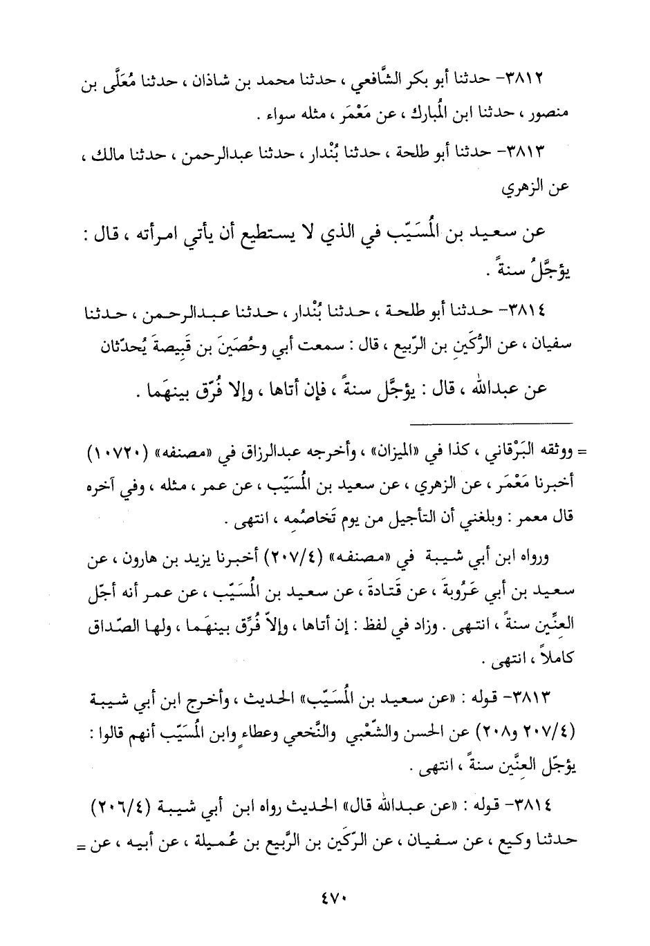 3813 - نا أَبُو طَلْحَةَ , نا بُنْدَارٌ , نا عَبْدُ الرَّحْمَنِ , نا مَالِكٌ , عَنِ الزُّهْرِيِّ , عَنْ سَعِيدِ بْنِ الْمُسَيِّبِ , فِي §الَّذِي لَا يَسْتَطِيعُ أَنْ يَأْتِيَ امْرَأَتَهُ , قَالَ: «يُؤَجَّلُ سَنَةً».
