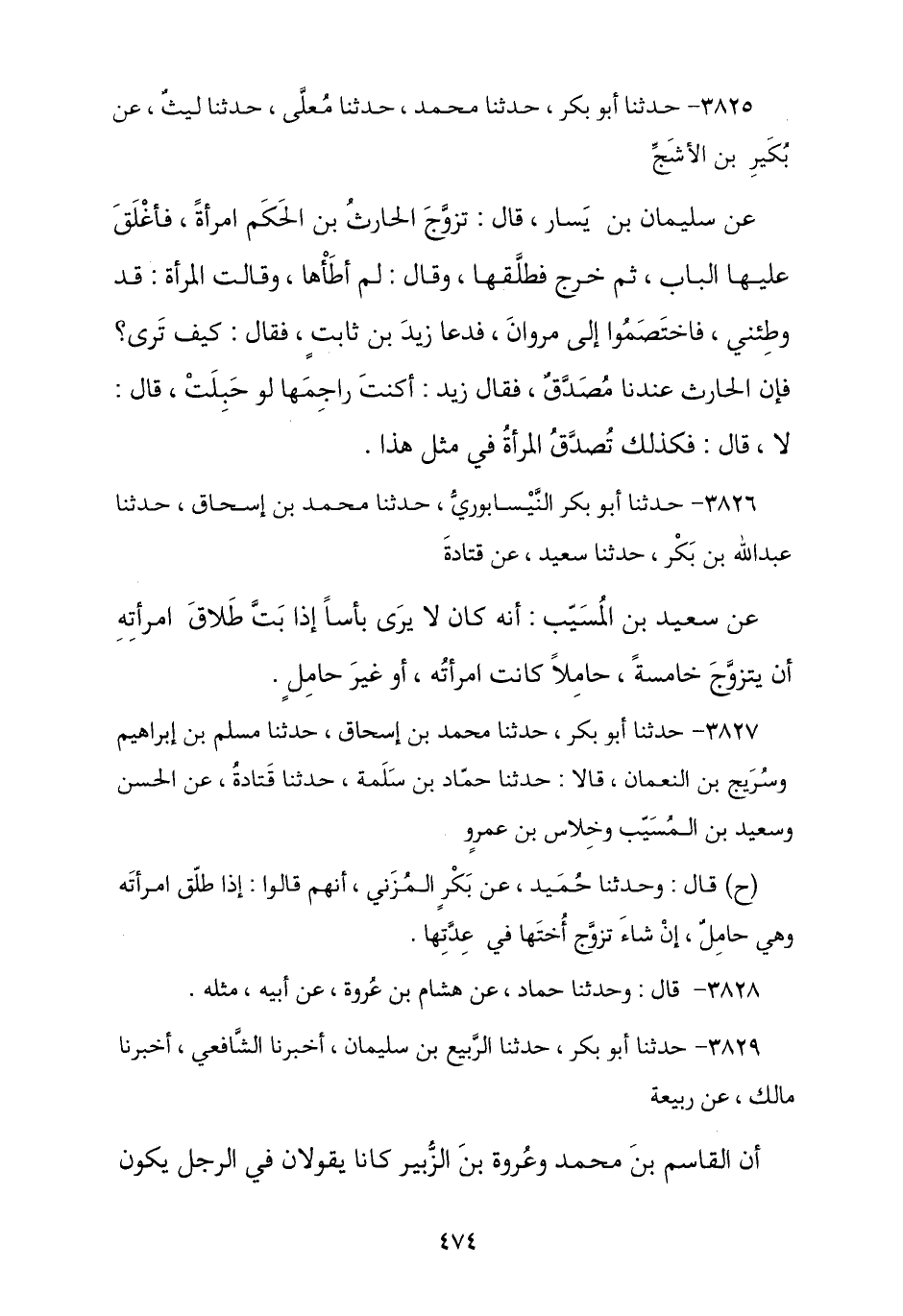 3826 - حَدَّثَنَا أَبُو بَكْرٍ النَّيْسَابُورِيُّ , نا مُحَمَّدُ بْنُ إِسْحَاقَ , نا عَبْدُ اللَّهِ بْنُ بُكَيْرٍ , نا سَعِيدٌ , عَنْ قَتَادَةَ , عَنْ سَعِيدِ بْنِ الْمُسَيِّبِ , «أَنَّهُ كَانَ لَا يَرَى بَأْسًا §إِذَا بَتَّ طَلَاقَ امْرَأَتِهِ أَنْ يَتَزَوَّجَ خَامِسَةً حَامِلًا كَانَتِ امْرَأَتُهُ أَوْ غَيْرِ حَامِلٍ»