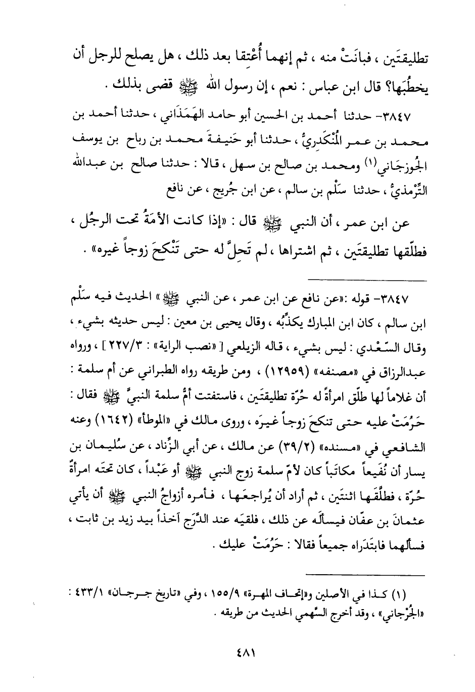 3847 - نا أَحْمَدُ بْنُ الْحُسَيْنِ أَبُو حَامِدٍ الْهَمْدَانِيُّ , نا أَحْمَدُ بْنُ مُحَمَّدِ بْنِ عُمَرَ الْمُنْكَدِرِيُّ , نا أَبُو حَنِيفَةَ مُحَمَّدُ بْنُ رَبَاحِ بْنِ يُوسُفَ الْجَوْزَجَانِيُّ , وَمُحَمَّدُ بْنُ صَالِحِ بْنِ سُهَيْلٍ , قَالَا: نا صَالِحُ بْنُ عَبْدِ اللَّهِ التِّرْمِذِيُّ , نا سَلْمُ بْنُ سَالِمٍ , عَنِ ابْنِ جُرَيْجٍ , عَنْ نَافِعٍ , عَنِ ابْنِ عُمَرَ , عَنِ النَّبِيِّ صَلَّى اللهُ عَلَيْهِ وَسَلَّمَ , قَالَ: § «إِذَا كَانَتِ الْأَمَةُ تَحْتَ الرَّجُلِ فَطَلَّقَهَا تَطْلِيقَتَيْنِ ثُمَّ اشْتَرَاهَا لَمْ تَحِلَّ لَهُ حَتَّى تَنْكِحَ زَوْجًا غَيْرَهُ»