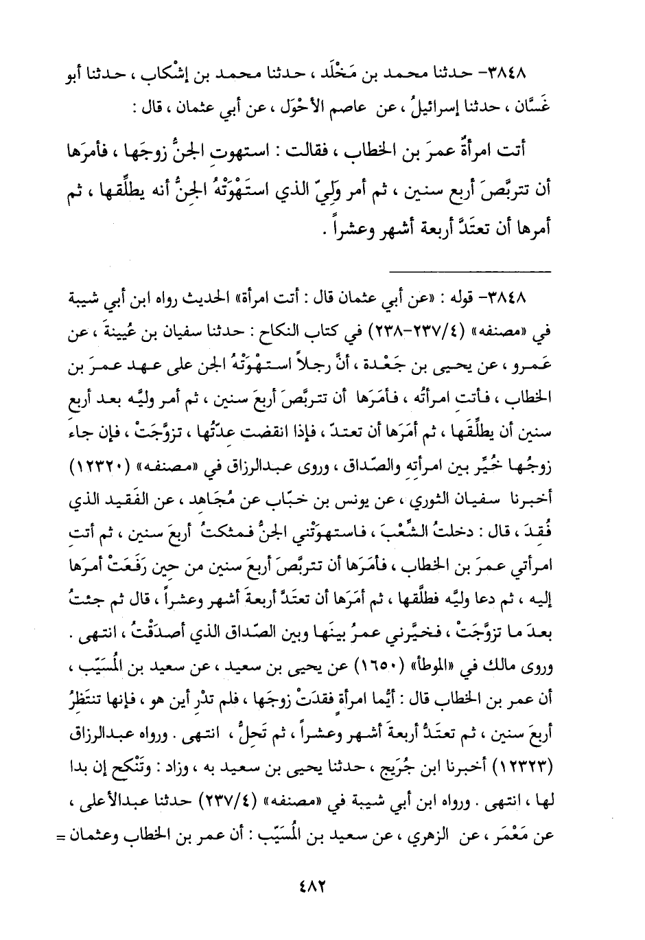3848 - نا مُحَمَّدُ بْنُ مَخْلَدٍ , نا مُحَمَّدُ بْنُ إِشْكَابَ , نا أَبُو غَسَّانَ , نا إِسْرَائِيلُ , عَنْ عَاصِمٍ الْأَحْوَلِ , عَنْ أَبِي عُثْمَانَ , قَالَ: أَتَتِ امْرَأَةٌ عُمَرَ بْنَ الْخَطَّابِ، قَالَتِ: §اسْتَهْوَتِ الْجِنُّ زَوْجَهَا , «فَأَمَرَهَا أَنْ تَتَرَبَّصَ أَرْبَعَ سِنِينَ ثُمَّ أَمَرَ وَلَّيَّ الَّذِي اسْتَهْوَتْهُ الْجِنُّ أَنْ يُطَلِّقَهَا , ثُمَّ أَمَرَهَا أَنْ تَعْتَدَّ أَرْبَعَةَ أَشْهُرٍ وَعَشْرًا»