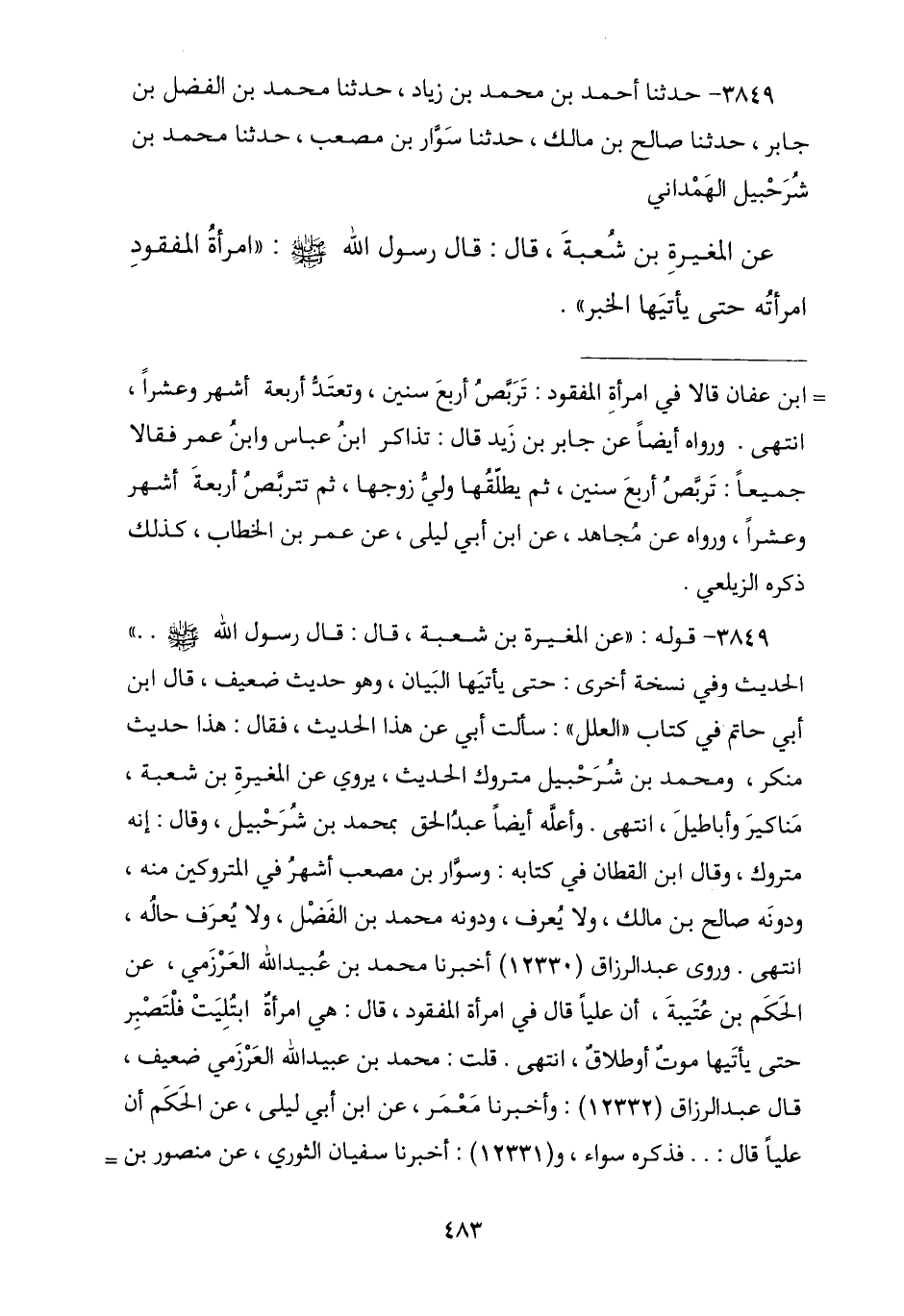 3849 - نا أَحْمَدُ بْنُ مُحَمَّدِ بْنِ زِيَادٍ , نا مُحَمَّدُ بْنُ الْفَضْلِ بْنِ جَابِرٍ , نا صَالِحُ بْنُ مَالِكٍ , نا سَوَّارُ بْنُ مُصْعَبٍ , نا مُحَمَّدُ بْنُ شُرَحْبِيلَ الْهَمْدَانِيُّ , عَنِ الْمُغِيرَةِ بْنِ شُعْبَةَ , قَالَ: قَالَ رَسُولُ اللَّهِ صَلَّى اللهُ عَلَيْهِ وَسَلَّمَ: § «امْرَأَةُ الْمَفْقُودِ امْرَأَتُهُ حَتَّى يَأْتِيَهَا الْخَبَرُ»