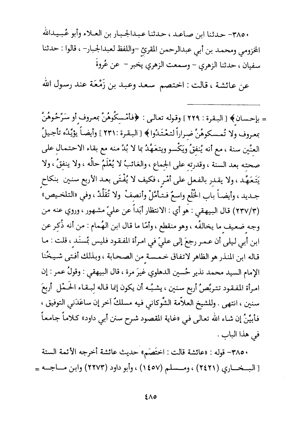 3850 - نا ابْنُ صَاعِدٍ , نا عَبْدُ الْجَبَّارِ بْنُ الْعَلَاءِ , وَأَبُو عُبَيْدِ اللَّهِ الْمَخْزُومِيُّ , وَمُحَمَّدُ بْنُ أَبِي عَبْدِ الرَّحْمَنِ الْمُقْرِئُ وَاللَّفْظُ لِعَبْدِ الْجَبَّارِ , قَالُوا: نا سُفْيَانُ , حَدَّثَنَا الزُّهْرِيُّ , عَنْ عُرْوَةَ , عَنْ عَائِشَةَ , قَالَتِ: اخْتَصَمَ سَعْدٌ وَعَبْدُ بْنُ زَمْعَةَ عِنْدَ رَسُولِ اللَّهِ -[486]- صَلَّى اللهُ عَلَيْهِ وَسَلَّمَ فِي ابْنِ أَمَةِ زَمْعَةَ , فَقَالَ سَعْدٌ: يَا رَسُولَ اللَّهِ أَوْصَانِي أَخِي عُتْبَةُ فَقَالَ: إِذَا دَخَلْتَ مَكَّةَ فَانْظُرِ ابْنَ أَمَةِ زَمْعَةَ فَاقْبِضْهُ فَإِنَّهُ ابْنِي , وَقَالَ عَبْدُ بْنُ زَمْعَةَ: يَا رَسُولَ اللَّهِ، أَخِي، ابْنُ أَمَةِ أَبِي، وُلِدَ عَلَى فِرَاشِ أَبِي , فَرَأَى رَسُولُ اللَّهِ صَلَّى اللهُ عَلَيْهِ وَسَلَّمَ شَبَهًا بَيِّنًا بِعُتْبَةَ , فَقَالَ: «هُوَ لَكَ يَا عَبْدُ بْنَ زَمْعَةَ , §الْوَلَدُ لِلْفِرَاشِ وَاحْتَجِبِي مِنْهُ يَا سَوْدَةُ». تَابَعَهُ مَالِكٌ , وَصَالِحُ بْنُ كَيْسَانَ , وَابْنُ إِسْحَاقَ , وَشُعَيْبُ بْنُ أَبِي حَمْزَةَ , وَابْنُ جُرَيْجٍ , وَعَقِيلٌ , وَابْنُ أَخِي الزُّهْرِيِّ , وَمَعْمَرُ بْنُ رَاشِدٍ , وَيُونُسُ , وَاللَّيْثُ بْنُ سَعْدٍ , وَسُفْيَانُ بْنُ حُسَيْنٍ وَغَيْرُهُمْ , وَفِي حَدِيثِ مَالِكٍ , وَمَعْمَرٍ , وَاللَّيْثِ , وَصَالِحِ بْنِ كَيْسَانَ , وَابْنِ إِسْحَاقَ , وَغَيْرِهِمْ: فَمَا رَأَى سَوْدَةَ قَطُّ حَتَّى لَحِقَ بِاللَّهِ