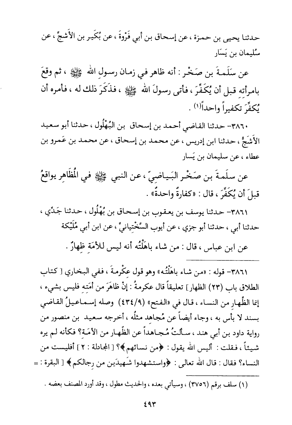 3860 - نَا أَحْمَدُ بْنُ إِسْحَاقَ بْنِ الْبُهْلُولِ , نا أَبُو سَعِيدٍ الْأَشَجُّ , نا عَبْدُ اللَّهِ بْنُ إِدْرِيسَ , عَنْ مُحَمَّدِ بْنِ إِسْحَاقَ , عَنْ مُحَمَّدِ بْنِ عَمْرِو بْنِ عَطَاءٍ , عَنْ سُلَيْمَانَ بْنِ يَسَارٍ , عَنْ سَلَمَةَ بْنِ صَخْرٍ الْبَيَاضِيِّ , عَنِ النَّبِيِّ صَلَّى اللهُ عَلَيْهِ وَسَلَّمَ فِي الْمُظَاهِرِ يُوَاقِعُ قَبْلَ أَنْ يُكَفِّرَ , قَالَ: § «كَفَّارَةٌ وَاحِدَةٌ»