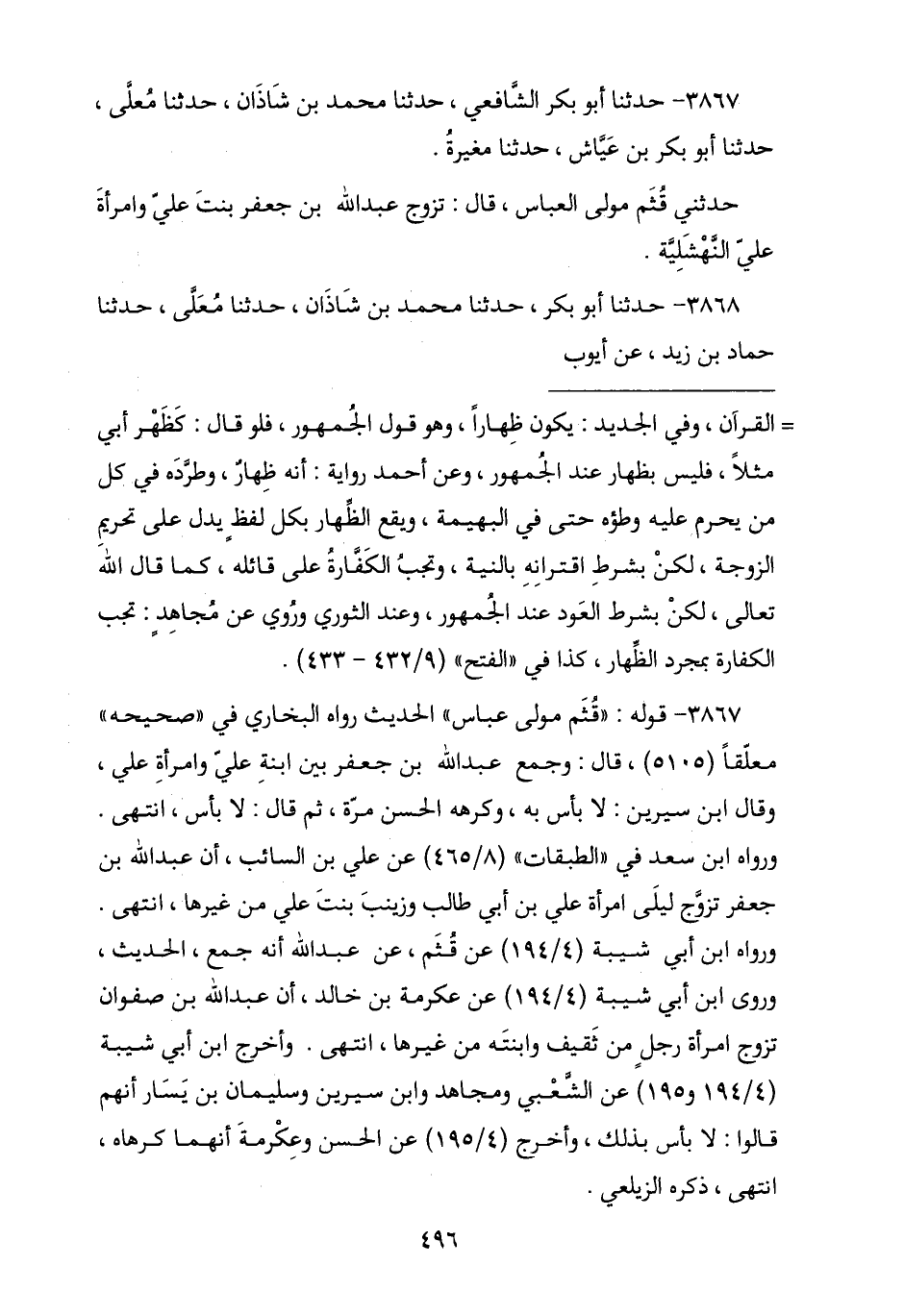3867 - نا أَبُو بَكْرٍ الشَّافِعِيُّ , نا مُحَمَّدُ بْنُ شَاذَانَ , نا مُعَلَّى , نا أَبُو بَكْرِ بْنُ عَيَّاشٍ , نا مُغِيرَةُ , حَدَّثَنِي قُثَمٌ مَوْلَى عَبَّاسٍ , قَالَ: § «تَزَوَّجَ عَبْدُ اللَّهِ بْنُ جَعْفَرٍ ابْنَةَ عَلِيٍّ , وَامْرَأَةَ عَلِيٍّ النَّهْشَلِيَّةَ»