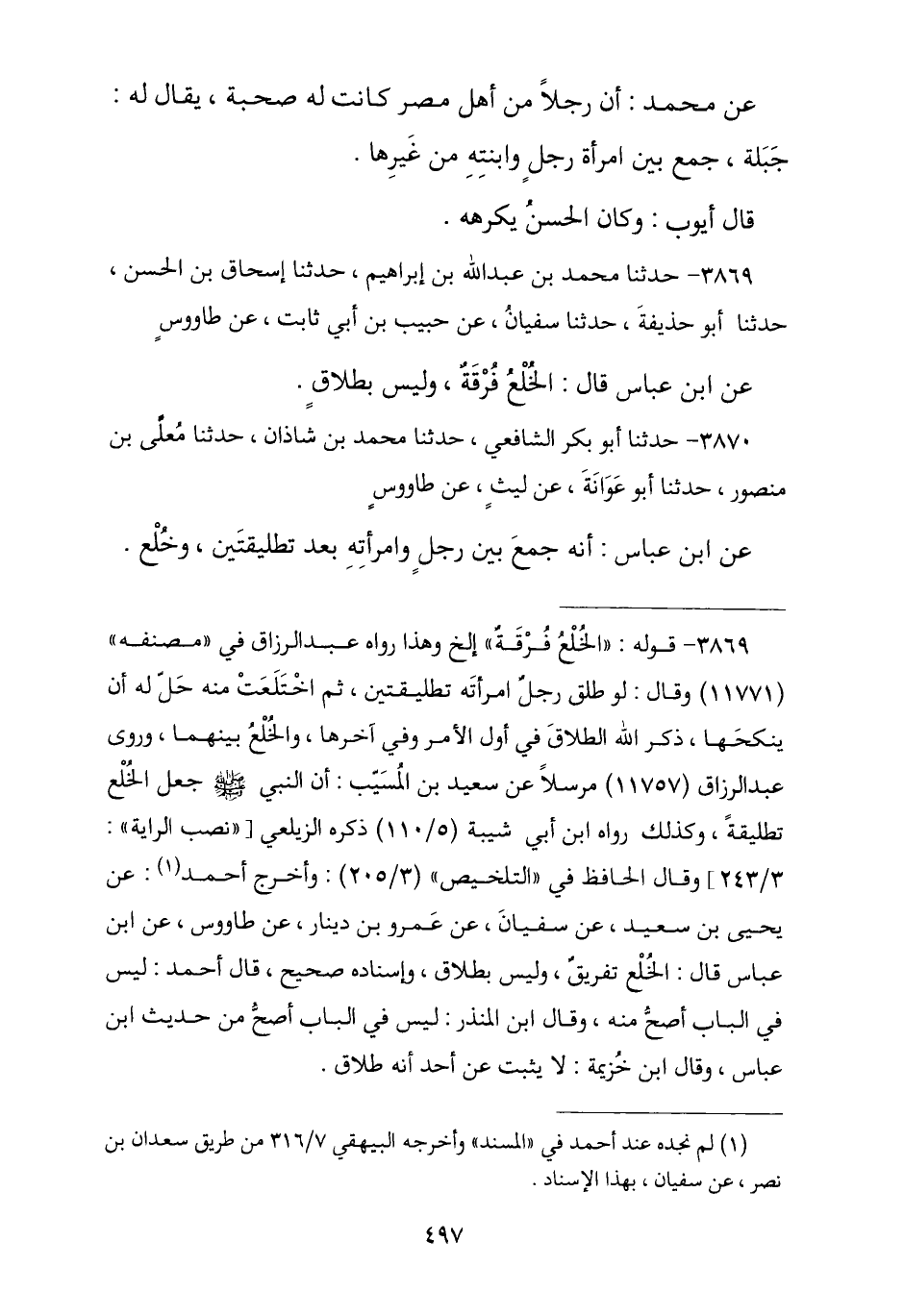 3869 - نا مُحَمَّدُ بْنُ عَبْدِ اللَّهِ بْنِ إِبْرَاهِيمَ , نا إِسْحَاقُ بْنُ الْحَسَنِ , نا أَبُو حُذَيْفَةَ , نا سُفْيَانُ , عَنْ حَبِيبِ بْنِ أَبِي ثَابِتٍ , عَنْ طَاوُسٍ , عَنِ ابْنِ عَبَّاسٍ , قَالَ: § «الْخُلْعُ فُرْقَةٌ وَلَيْسَ بِطَلَاقٍ»