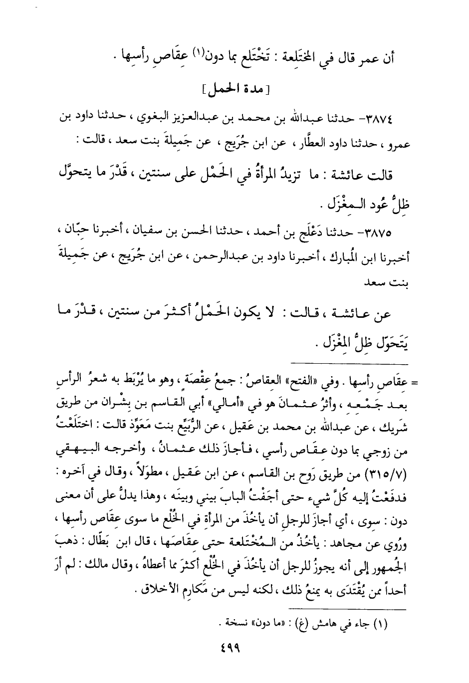 3874 - نا عَبْدُ اللَّهِ بْنُ مُحَمَّدِ بْنِ عَبْدِ الْعَزِيزِ , نا دَاوُدُ بْنُ عَمْرٍو , نا دَاوُدُ الْعَطَّارُ , عَنِ ابْنِ جُرَيْجٍ , عَنْ جَمِيلَةَ بِنْتِ سَعْدٍ , قَالَتْ: قَالَتْ عَائِشَةُ رَضِيَ اللَّهُ عَنْهَا: § «مَا تَزِيدُ الْمَرْأَةِ فِي الْحَمْلِ عَلَى سَنَتَيْنِ قَدْرَ مَا يَتَحَوَّلُ ظِلُّ عُودِ الْمِغْزَلِ»