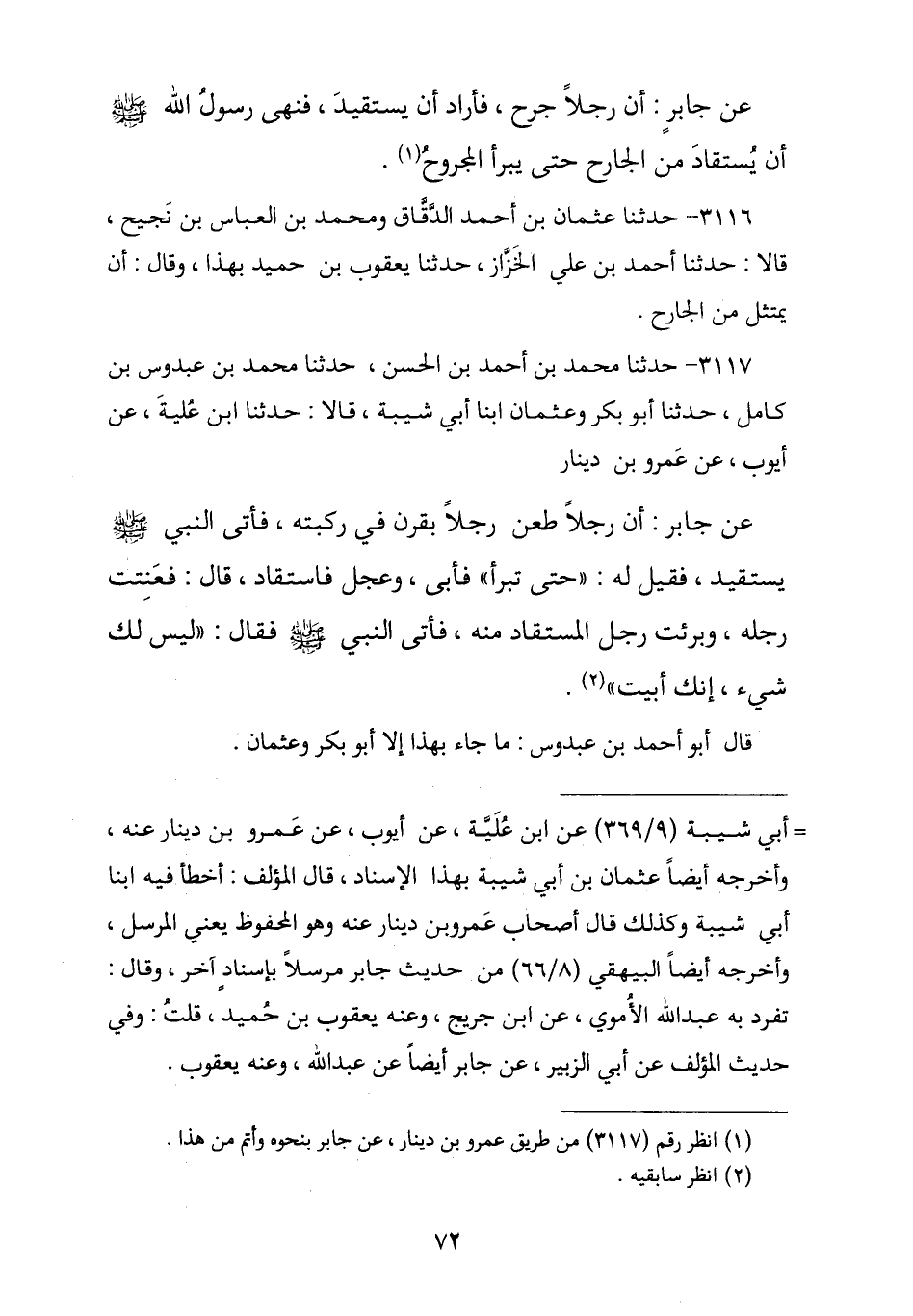 3117 - نا مُحَمَّدُ بْنُ أَحْمَدَ بْنِ الْحَسَنِ , نا مُحَمَّدُ بْنُ عَبْدُوسَ بْنِ كَامِلٍ , نا أَبُو بَكْرٍ , وَعُثْمَانُ ابْنَا أَبِي شَيْبَةَ , قَالَا: نا ابْنُ عُلَيَّةَ , عَنْ أَيُّوبَ , عَنْ عَمْرِو بْنِ دِينَارٍ , عَنْ جَابِرٍ , أَنَّ رَجُلًا طَعَنَ رَجُلًا بِقَرْنٍ فِي رُكْبَتِهِ , فَأَتَى النَّبِيَّ صَلَّى اللهُ عَلَيْهِ وَسَلَّمَ يَسْتَقِيدُ , فَقِيلَ لَهُ: حَتَّى تَبْرَأَ , فَأَبَى وَعَجَّلَ فَاسْتَقَادَ , قَالَ: فَعَنَتَتْ رِجْلُهُ وَبَرِئَتْ رِجْلُ الْمُسْتَقَادِ مِنْهُ , فَأَتَى النَّبِيَّ صَلَّى اللهُ عَلَيْهِ وَسَلَّمَ , فَقَالَ لَهُ: § «لَيْسَ لَكَ شَيْءٌ إِنَّكَ أَبِيتَ». قَالَ أَبُو أَحْمَدَ بْنُ عُبْدُوسَ: مَا جَاءَ بِهَذَا إِلَّا أَبُو بَكْرٍ , وَعُثْمَانُ. -[73]- قَالَ الشَّيْخُ: أَخْطَأَ فِيهِ ابْنَا أَبِي شَيْبَةَ , وَخَالَفَهُمَا أَحْمَدُ بْنُ حَنْبَلٍ وَغَيْرُهُ , عَنِ ابْنِ عُلَيَّةَ , عَنْ أَيُّوبَ , عَنْ عَمْرٍو مُرْسَلًا , وَكَذَلِكَ قَالَ أَصْحَابُ عَمْرِو بْنِ دِينَارٍ عَنْهُ , وَهُوَ الْمَحْفُوظُ مُرْسَلًا.