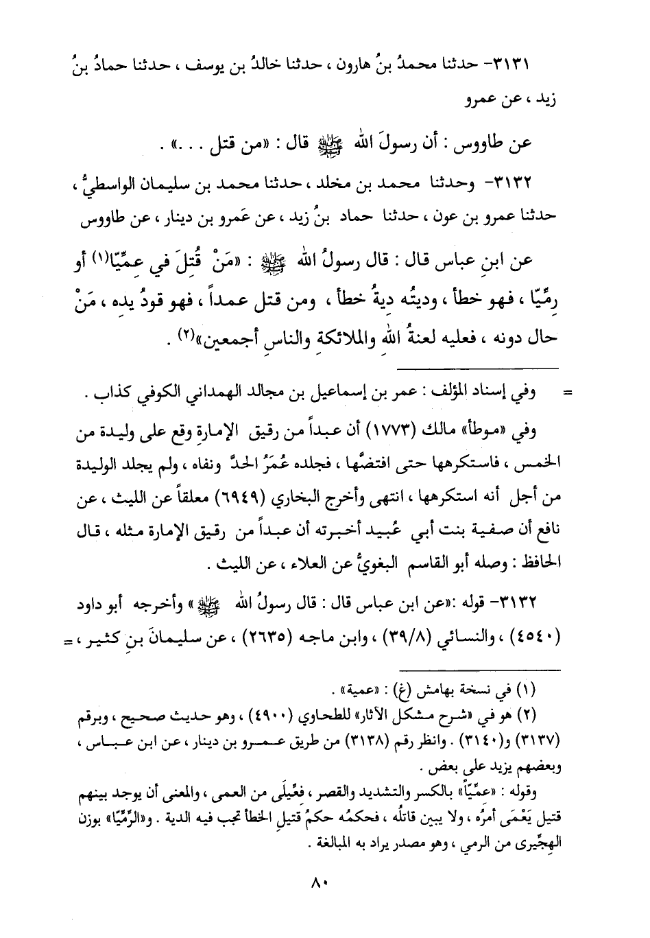 3132 - ح. وَنا مُحَمَّدُ بْنُ مَخْلَدٍ , نا مُحَمَّدُ بْنُ سُلَيْمَانَ الْوَاسِطِيُّ , نا عَمْرُو بْنُ عَوْنٍ , نا حَمَّادُ بْنُ زَيْدٍ , عَنْ عَمْرِو بْنِ دِينَارٍ , عَنْ طَاوُسٍ , عَنِ ابْنِ عَبَّاسٍ , قَالَ: قَالَ رَسُولُ اللَّهِ صَلَّى اللهُ عَلَيْهِ وَسَلَّمَ: § «مَنْ قُتِلَ فِي عِمِّيَّا أَوْ رِمِّيَّا فَهُوَ خَطَأٌ وَدِيَتُهُ دِيَةُ خَطَإٍ , وَمَنْ قَتَلَ عَمْدًا فَهُوَ قَوَدُ يَدِهِ , مَنْ حَالَ دُونَهُ فَعَلَيْهِ لَعْنَةُ اللَّهِ وَالْمَلَائِكَةِ وَالنَّاسِ أَجْمَعِينَ»