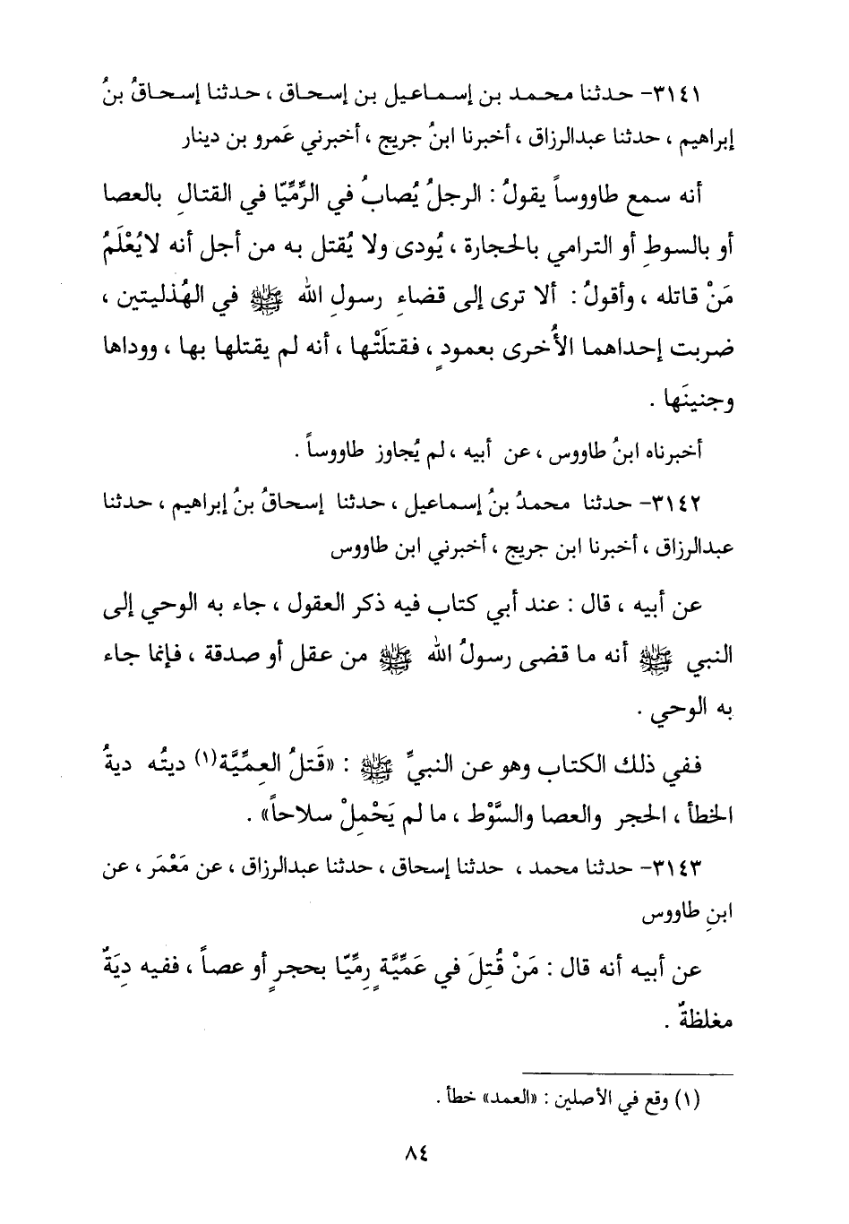 3142 - نا مُحَمَّدُ بْنُ إِسْمَاعِيلَ , نا إِسْحَاقُ بْنُ إِبْرَاهِيمَ , أنا عَبْدُ الرَّزَّاقِ , أنا ابْنُ جُرَيْجٍ , أَخْبَرَنِي ابْنُ طَاوُسٍ , عَنْ أَبِيهِ , قَالَ: عِنْدَ أَبِي كِتَابٌ فِيهِ ذِكْرُ الْعُقُولِ , جَاءَ بِهِ الْوَحْي إِلَى النَّبِيِّ صَلَّى اللهُ عَلَيْهِ وَسَلَّمَ أَنَّهُ مَا قَضَى رَسُولُ اللَّهِ صَلَّى اللهُ عَلَيْهِ وَسَلَّمَ مِنْ عَقْلٍ أَوْ صَدَقَةٍ فَإِنَّمَا جَاءَ بِهِ الْوَحْي فَفِي ذَلِكَ الْكِتَابِ , وَهُوَ عَنِ النَّبِيِّ صَلَّى اللهُ عَلَيْهِ وَسَلَّمَ: § «قَتْلُ الْعَمِيَّةِ دِيَتُهُ دِيَةُ الْخَطَأِ , الْحَجَرُ وَالْعَصَا وَالسَّوْطُ مَا لَمْ يَحْمِلْ سِلَاحًا»