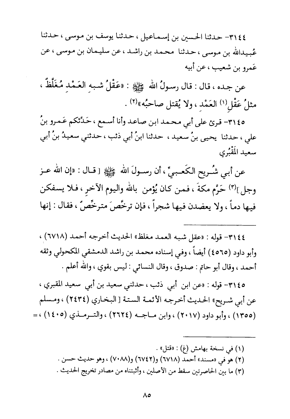 3144 - نا الْحُسَيْنُ بْنُ إِسْمَاعِيلَ , نا يُوسُفُ بْنُ مُوسَى , نا عُبَيْدُ اللَّهِ بْنُ مُوسَى , نا مُحَمَّدُ بْنُ رَاشِدٍ , عَنْ سُلَيْمَانَ بْنِ مُوسَى , عَنْ عَمْرِو بْنِ شُعَيْبٍ , عَنْ أَبِيهِ , عَنْ جَدِّهِ , قَالَ: قَالَ رَسُولُ اللَّهِ صَلَّى اللهُ عَلَيْهِ وَسَلَّمَ: § «عَقْلُ شِبْهِ الْعَمْدِ مُغَلَّظٌ مِثْلُ قَتْلِ الْعَمْدِ وَلَا يُقْتَلُ صَاحِبُهُ»
