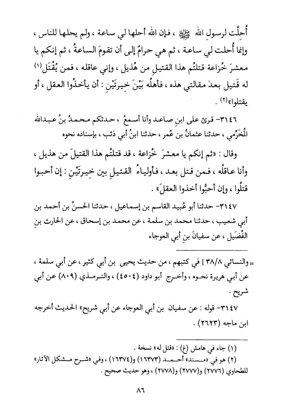 3146 - قُرِئَ عَلَى ابْنِ صَاعِدٍ وَأَنَا أَسْمَعُ , حَدَّثَكُمْ مُحَمَّدُ بْنُ عَبْدِ اللَّهِ الْمَخْزُومِيُّ , نا عُثْمَانُ بْنُ عُمَرَ , نا ابْنُ أَبِي ذِئْبٍ , بِإِسْنَادِهِ نَحْوَهُ وَقَالَ: " §ثُمَّ إِنَّكُمْ يَا مَعْشَرَ خُزَاعَةَ قَدْ قَتَلْتُمْ: هَذَا الْقَتِيلُ مِنْ هُذَيْلٍ , وَأَنَا عَاقِلُهُ , فَمَنْ قُتِلَ بَعْدُ فَأَوْلِيَاءُ الْقَتِيلِ بَيْنَ خِيَرَتَيْنِ , إِنْ أَحَبُّوا قَتَلُوا , وَإِنْ أَحَبُّوا أَخَذُوا الْعَقْلَ "
