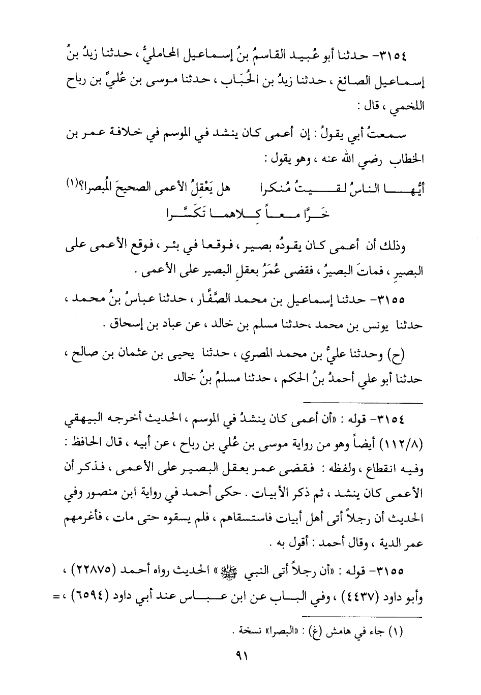 3154 - نا أَبُو عُبَيْدٍ الْقَاسِمُ بْنُ إِسْمَاعِيلَ الْمَحَامِلِيُّ , نا زَيْدُ بْنُ إِسْمَاعِيلَ الصَّائِغُ , نا زَيْدُ بْنُ الْحُبَابِ , نا مُوسَى بْنُ عَلِيِّ بْنِ رَبَاحٍ اللَّخْمِيُّ , قَالَ: سَمِعْتُ أَبِي , يَقُولُ: إِنَّ أَعْمَى كَانَ يَنْشُدُ فِي الْمَوْسِمِ فِي خِلَافَةِ عُمَرَ بْنِ الْخَطَّابِ رَضِيَ اللَّهُ عَنْهُ وَهُوَ يَقُولُ: