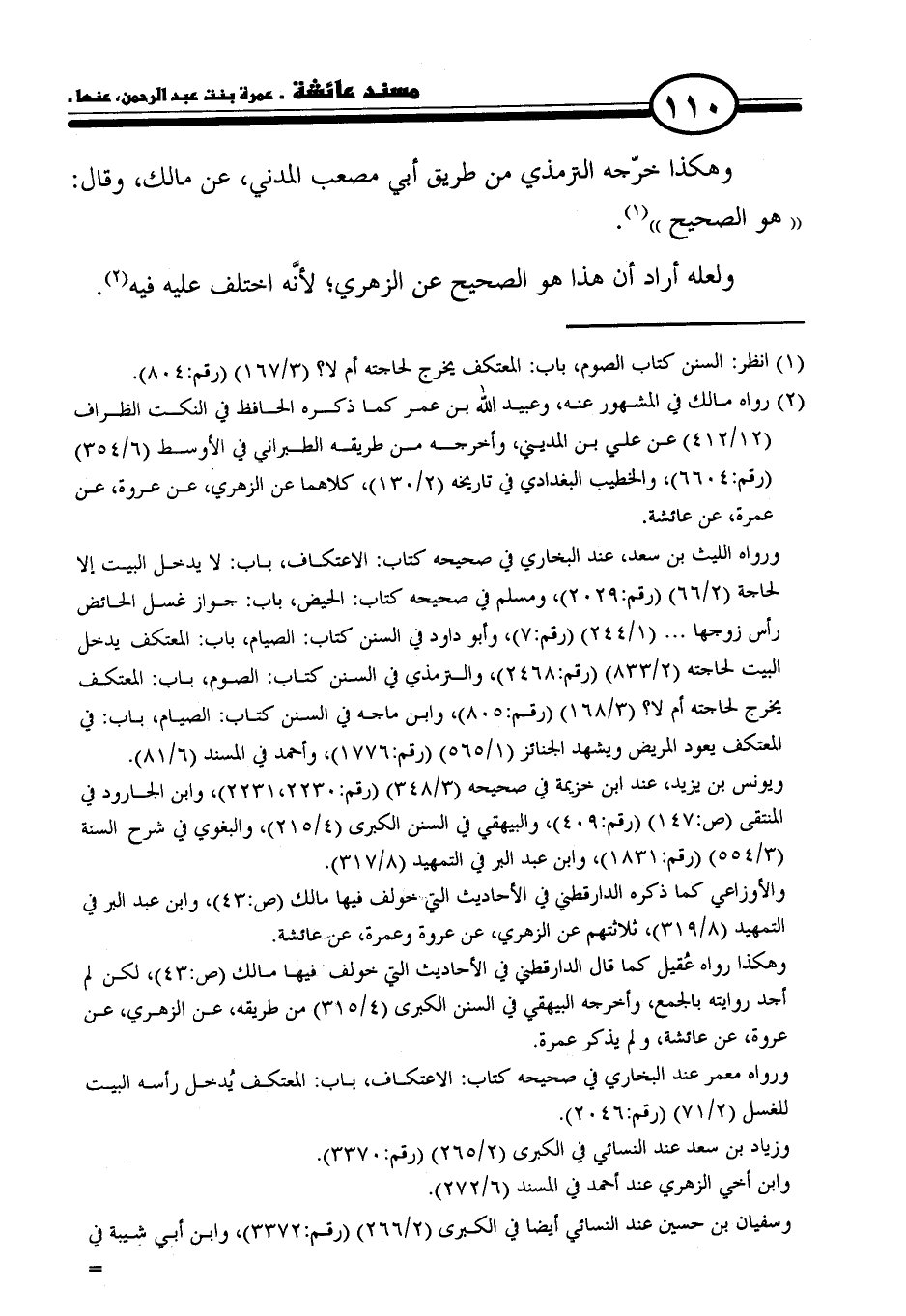 (٢) رواه مالك في المشهور عنه، وعبيد الله بن عمر كما ذكره الحافظ في النكت الظراف (١٢/ ٤١٢) عن علي بن المديني، وأخرجه من طريقه الطبراني في الأوسط (٦/ ٣٥٤) (رقم: ٦٦٠٤)، والخطيب البغدادي في تاريخه (٢/ ١٣٠)، كلاهما عن الزهري، عن عروة، عن عمرة، عن عائشة.