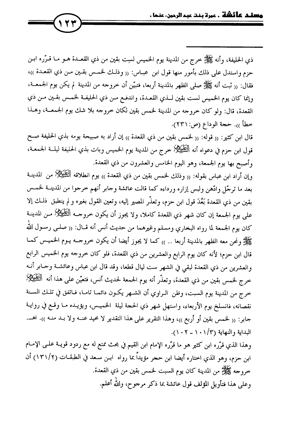 وهذا الذي قرّره ابن كثير هو ما قرّره الإمام ابن القيم في بحث ممتع له مع ردود قوية على الإمام ابن حزم، وهو الذي اختاره أيضا ابن حجر مؤيدًا بما رواه ابن سعد في الطبقات (٢/ ١٣١) أن خروجه - صلى الله عليه وسلم - من المدينة كان يوم السبت لخمس بقين من ذي القعدة.