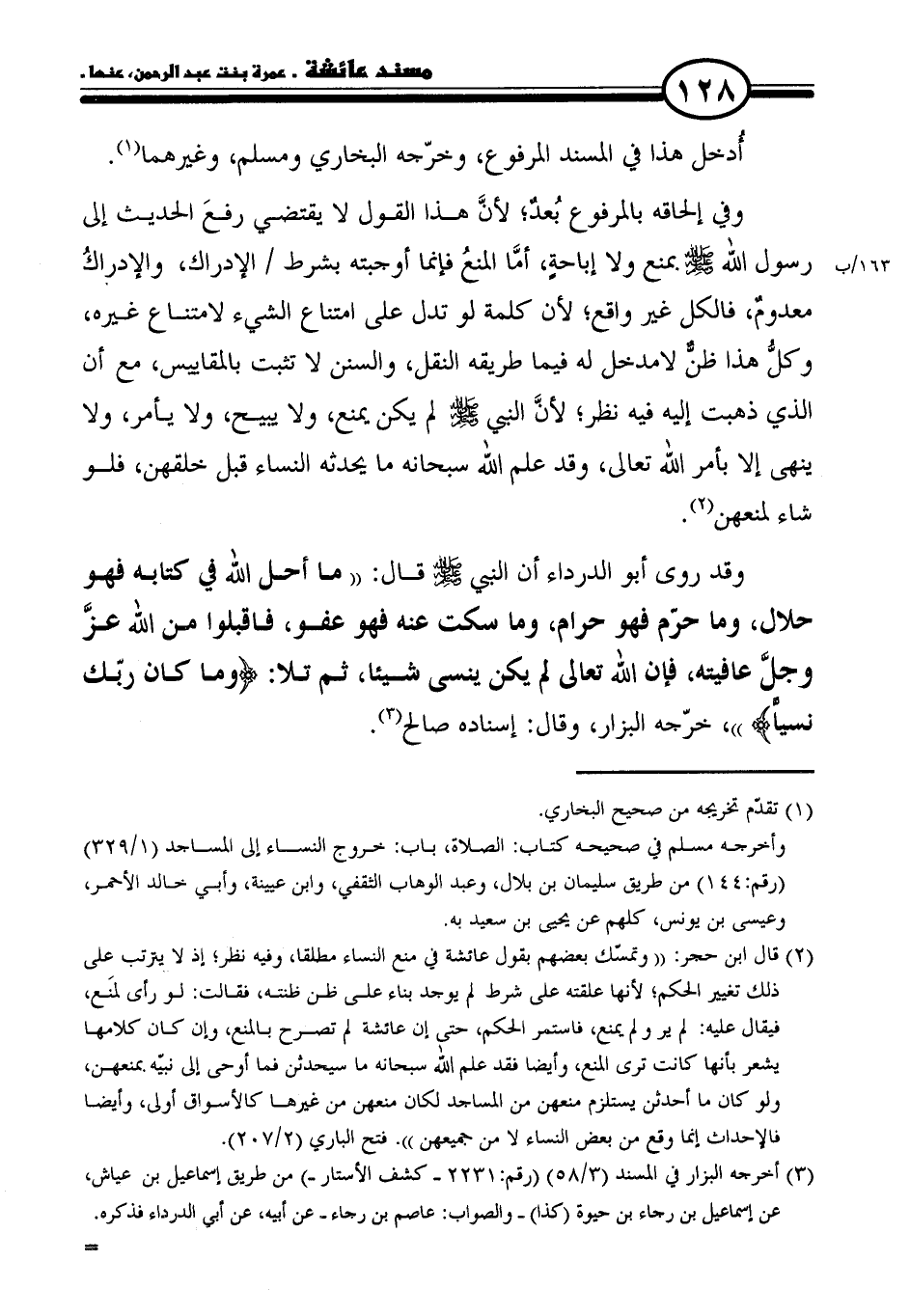 وقد روى أبو الدرداء أن النبي - صلى الله عليه وسلم - قال: "ما أحل الله في كتابه فهو حلال، وما حرّم فهو حرام، وما سكت عنه فهو عفو، فاقبلوا من الله عزَّ وجلَّ عافيته، فإن الله تعالى لم يكن ينسى شيئا، ثم تلا: {وَمَا بَيْنَ ذَلِكَ وَمَا كَانَ رَبُّكَ نَسِيًّا} "، خرّجه البزار، وقال: إسناده صالح (٣).