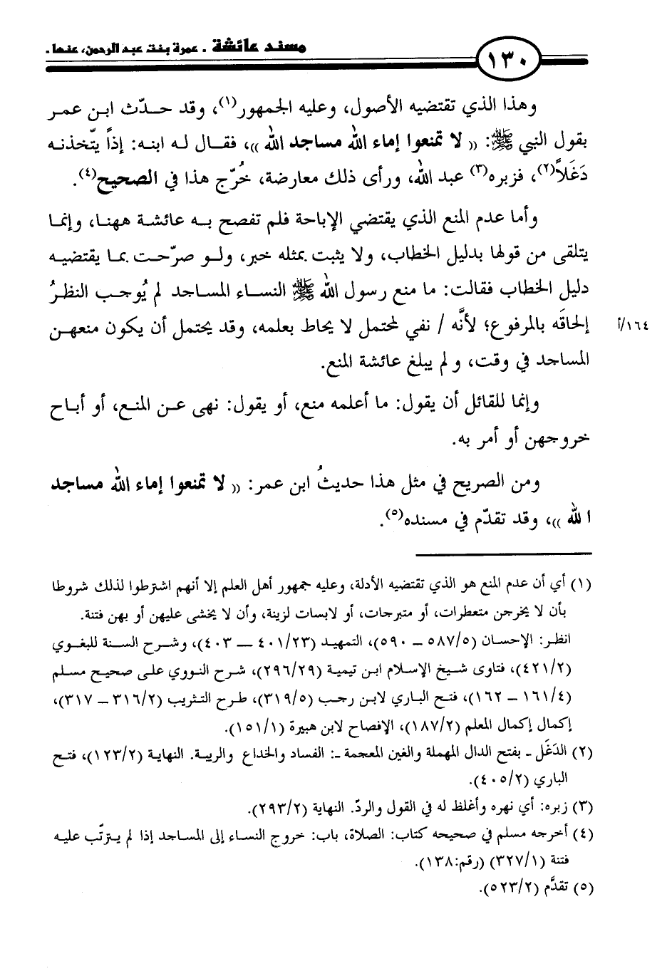 ومن الصريح في مثل هذا حديثُ ابن عمر: "لا تمنعوا إماء الله مساجد الله"، وقد تقدّم في مسنده (٥).