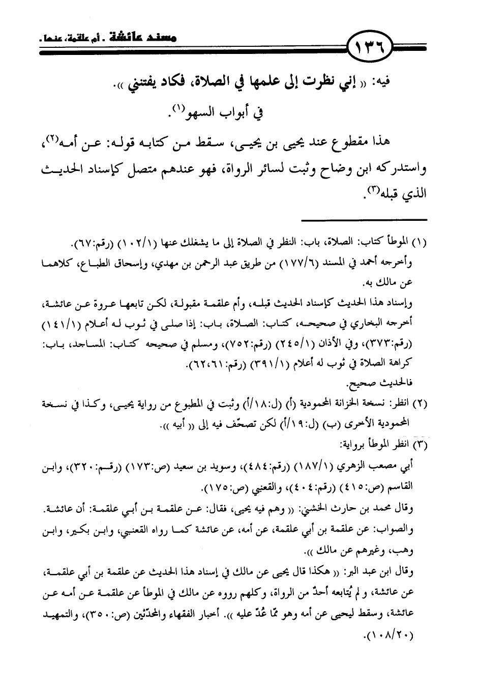 وقال ابن عبد البر: "هكذا قال يحيى عن مالك في إسناد هذا الحديث عن علقمة بن أبي علقمة، عن عائشة، ولم يُتابعه أحدٌ من الرواة، وكلهم رووه عن مالك في الموطأ عن علقمة عن أمه عن عائشة، وسقط ليحيى عن أمه وهو مما عُدّ عليه". أخبار الفقهاء والمحدّثين (ص: ٣٥٠)، والتمهيد (٢٠/ ١٠٨).