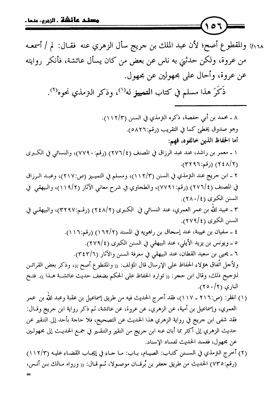 (١) انظر: (ص: ٢١٦ - ١١٧)، فقد أخرج الحديث فيه من طريق إسماعيل بن عقبة وعبد الله بن عمر العمري، وإسماعيل بن أمية، عن الزهري، عن عروة، عن عائشة، ثم ذكر رواية ابن جريج وقال: فقد شفى ابن جريج في رواية الزهري هذا الحديث عن التصحيح، فلا حاجة بأحد إلى التنقير عن حديث الزهري إلى أكثر مما أبان عنه ابن جريج من النقير والتنقير في جمع الحديث إلى مجهولين عن مجهول، ففسد الحديث لفساد الإسناد.