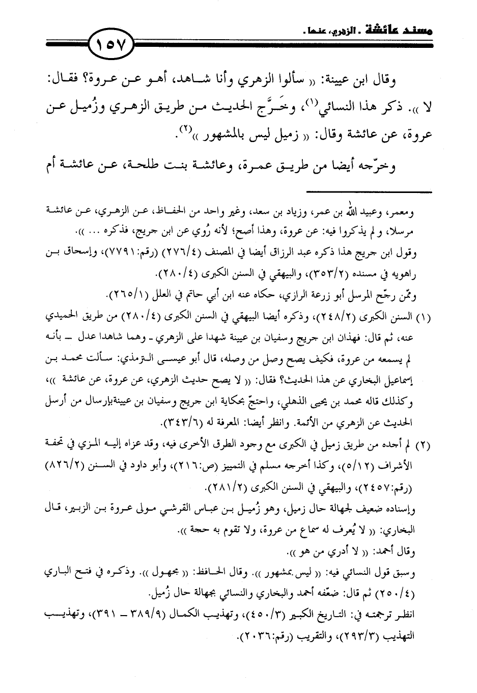 وقال ابن عيينة: "سألوا الزهري وأنا شاهد، أهو عن عروة؟ فقال: لا". ذكر هذا النسائي (١)، وخَرَّج الحديث من طريق الزهري وزُميل عن عروة، عن عائشة وقال: "زميل ليس بالمشهور" (٢).