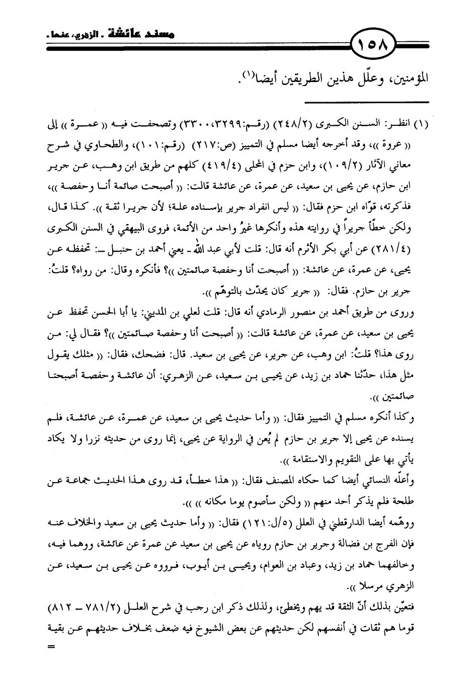 وروى من طريق أحمد بن منصور الرمادي أنه قال: قلت لعلي بن المديني: يا أبا الحسن تحفظ عن يحيى بن سعيد، عن عمرة، عن عائشة قالت: "أصبحت أنا وحفصة صائمتين"؟ فقال لي: من روى هذا؟ قلتُ: ابن وهب، عن جرير، عن يحيى بن سعيد. قال: فضحك، فقال: "مثلك يقول مثل هذا، حدّثنا حماد بن زيد، عن يحيى بن سعيد، عن الزهري: أن عائشة وحفصة أصبحتا صائمتين".