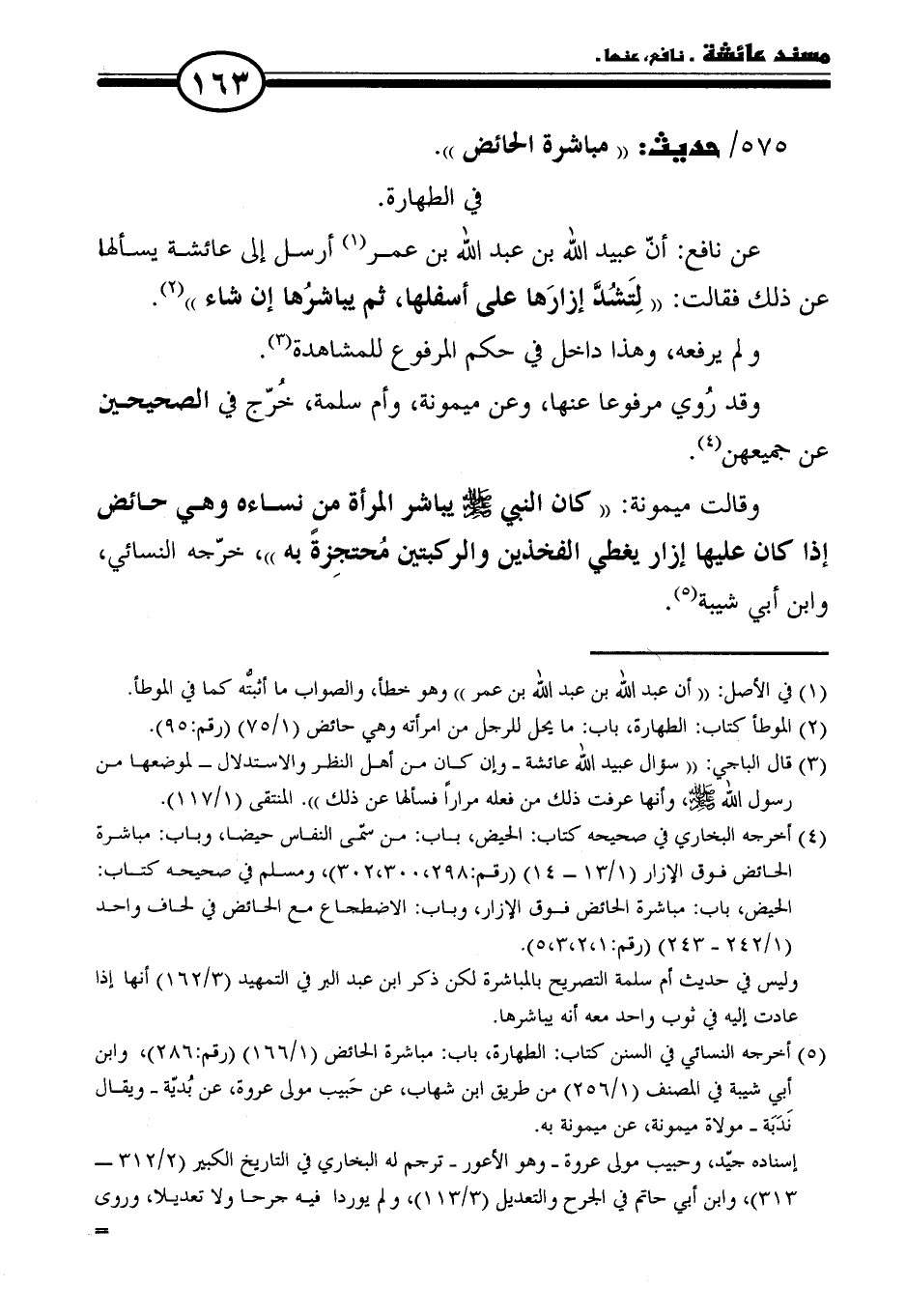 (٤) أخرجه البخاري في صحيحه كتاب: الحيض، باب: من سمّى النفاس حيضا، وباب: مباشرة الحائض فوق الإزار (١/ ١٣ - ١٤) (رقم: ٢٩٨، ٣٠٠، ٣٠٢)، ومسلم في صحيحه كتاب: الحيض، باب: مباشرة الحائض فوق الإزار، وباب: الاضطجاع مع الحائض في لحاف واحد (١/ ٢٤٢ - ٢٤٣) (رقم: ١، ٢، ٣، ٥).